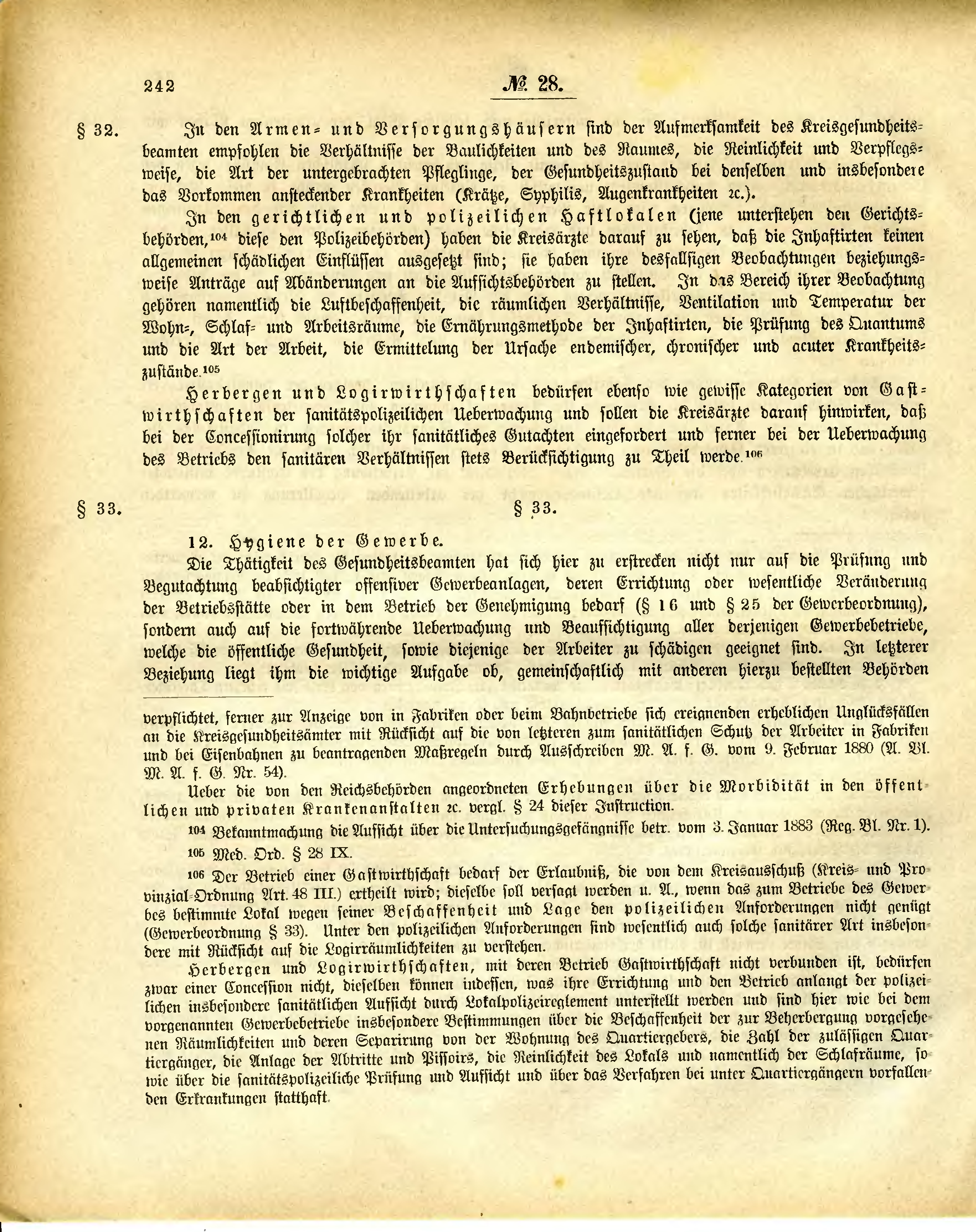 | § 32. | In den Armen- und Versorgungshäusern sind der Aufmerksamkeit des Kreisgesundheitsbeamten empfohlen die Verhältnisse der Baulichkeiten und des Raumes, die Reinlichkeit und Verpflegsweise, die Art der untergebrachten Pfleglinge, der Gesundheitszustand bei denselben und insbesondere das Vorkommen ansteckender Krankheiten (Krätze, Syphilis, Augenkrankheiten etc.). In den gerichtlichen und polizeilichen Haftlokalen (jene unterstehen den Gerichtsbehörden,104 diese den Polizeibehörden) haben die Kreisärzte darauf zu sehen, daß die Inhaftirten keinen allgemeinen schädlichen Einflüssen ausgesetzt sind; sie haben ihre desfallsigen Beobachtungen beziehungsweise Anträge auf Abänderungen an die Aufsichtsbehörden zu stellen. In das Bereich ihrer Beobachtung gehören namentlich die Luftbeschaffenheit, die räumlichen Verhältnisse, Ventilation und Temperatur der Wohn-, Schlaf- und Arbeitsräume, die Ernährungsmethode der Inhaftirten, die Prüfung des Quantums und die Art der Arbeit, die Ermittelung der Ursache endemischer, chronischer und acuter Krankheitszustände.105 Herbergen und Logirwirthschaften bedürfen ebenso wie gewisse Kategorien von Gastwirthschaften der sanitätspolizeilichen Ueberwachung und sollen die Kreisärzte darauf hinwirken, daß bei der Concessionirung solcher ihr sanitätliches Gutachten eingefordert und ferner bei der Ueberwachung des Betriebs den sanitären Verhältnissen stets Berücksichtigung zu Theil werde.106 |