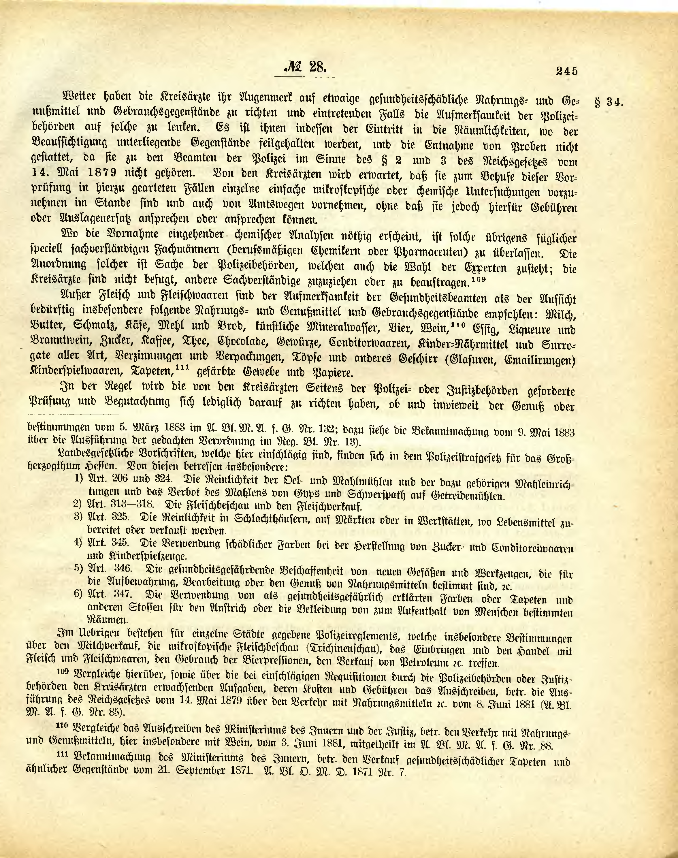 109 Vergleiche hierüber, sowie über die bei einschlägigen Requisitionen durch die Polizeibehörden oder Justizbehörden den Kreisärzten erwachsenden Aufgaben, deren Kosten und Gebühren das Ausschreiben, betr. die Ausführung des Reichsgesetzes vom 14. Mai 1879 über den Verkehr mit Nahrungsmitteln etc. vom 8. Juni 1881 (A. Bl. M. A. f. G. Nr. 85).
