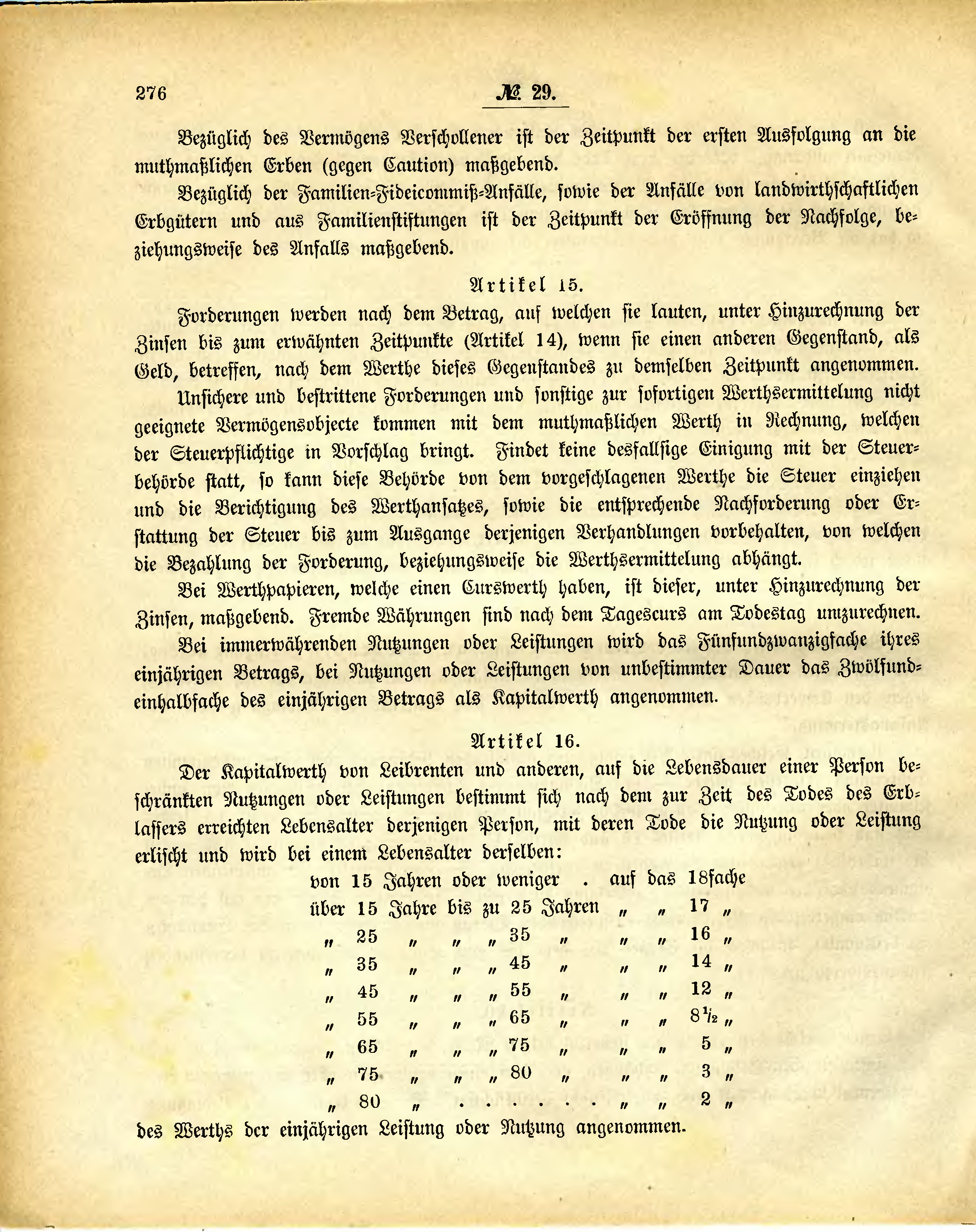 Der Kapitalwerth von Leibrenten und anderen, auf die Lebensdauer einer Person beschränkten Nutzungen oder Leistungen bestimmt sich nach dem zur Zeit des Todes des Erblassers erreichten Lebensalter derjenigen Person, mit deren Tode die Nutzung oder Leistung erlischt und wird bei einem Lebensalter derselben: