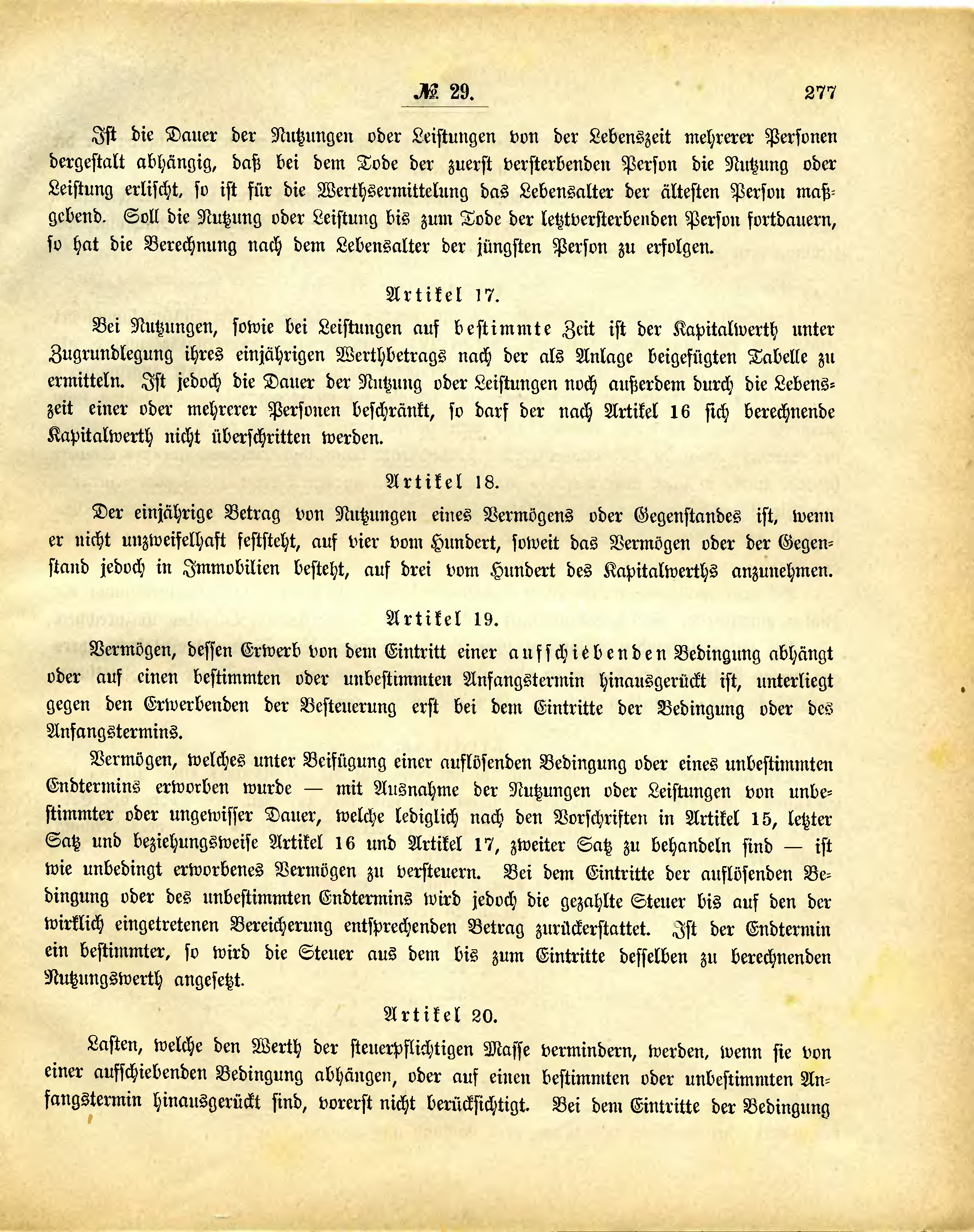 Bei Nutzungen, sowie bei Leistungen auf bestimmte Zeit ist der Kapitalwerth unter Zugrundlegung ihres einjährigen Werthbetrags nach der als Anlage beigefügten Tabelle zu ermitteln. Ist jedoch die Dauer der Nutzung oder Leistungen noch außerdem durch die Lebenszeit einer oder mehrerer Personen beschränkt, so darf der nach Artikel 16 sich berechnende Kapitalwerth nicht überschritten werden.