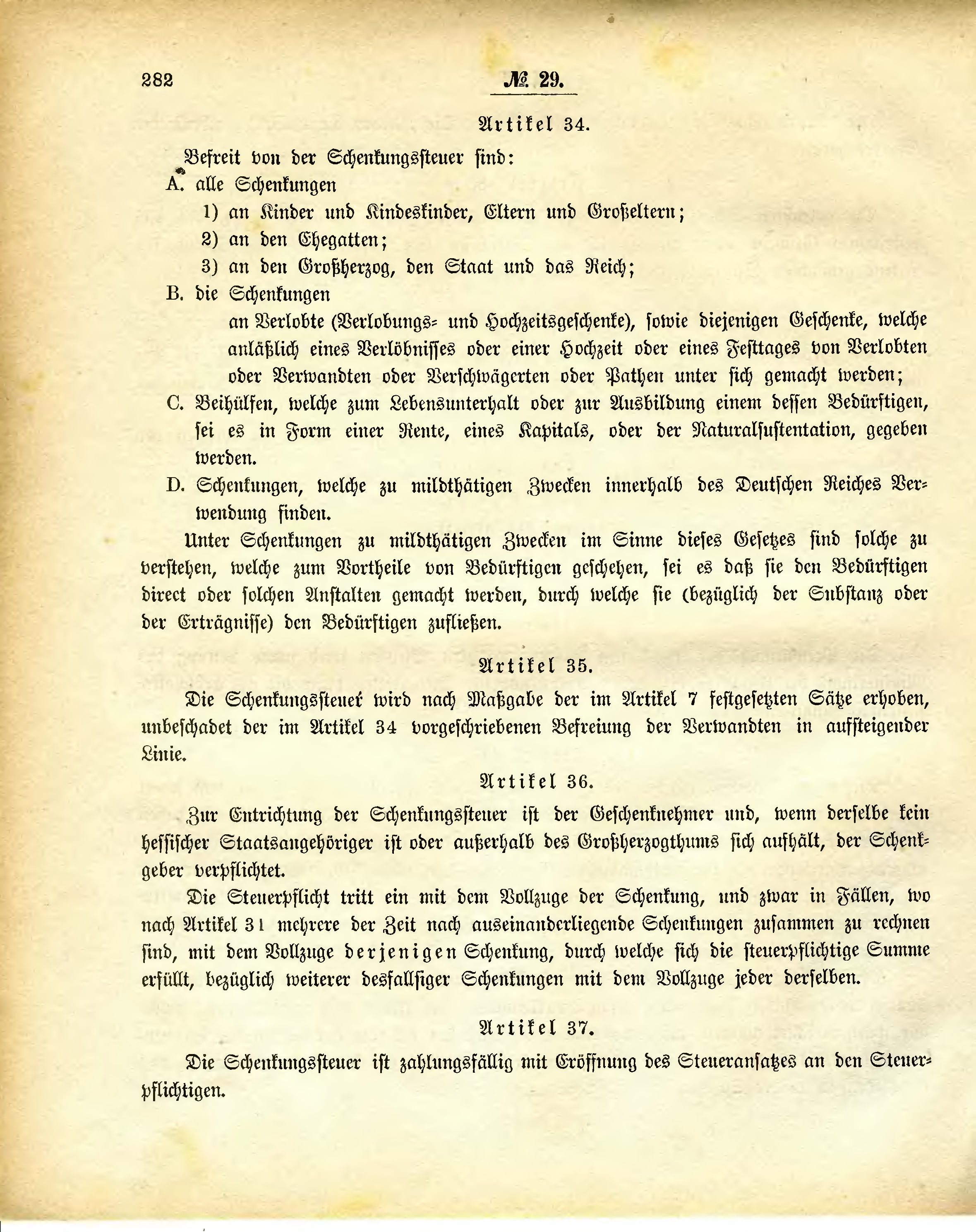 Die Steuerpflicht tritt ein mit dem Vollzuge der Schenkung, und zwar in Fällen, wo nach Artikel 31 mehrere der Zeit nach auseinanderliegende Schenkungen zusammen zu rechnen sind, mit dem Vollzuge {{Sperrschrift | derjenigen\\ Schenkung, durch welche sich die steuerpflichtige Summe erfüllt, bezüglich weiterer desfallsiger Schenkungen mit dem Vollzuge jeder derselben.