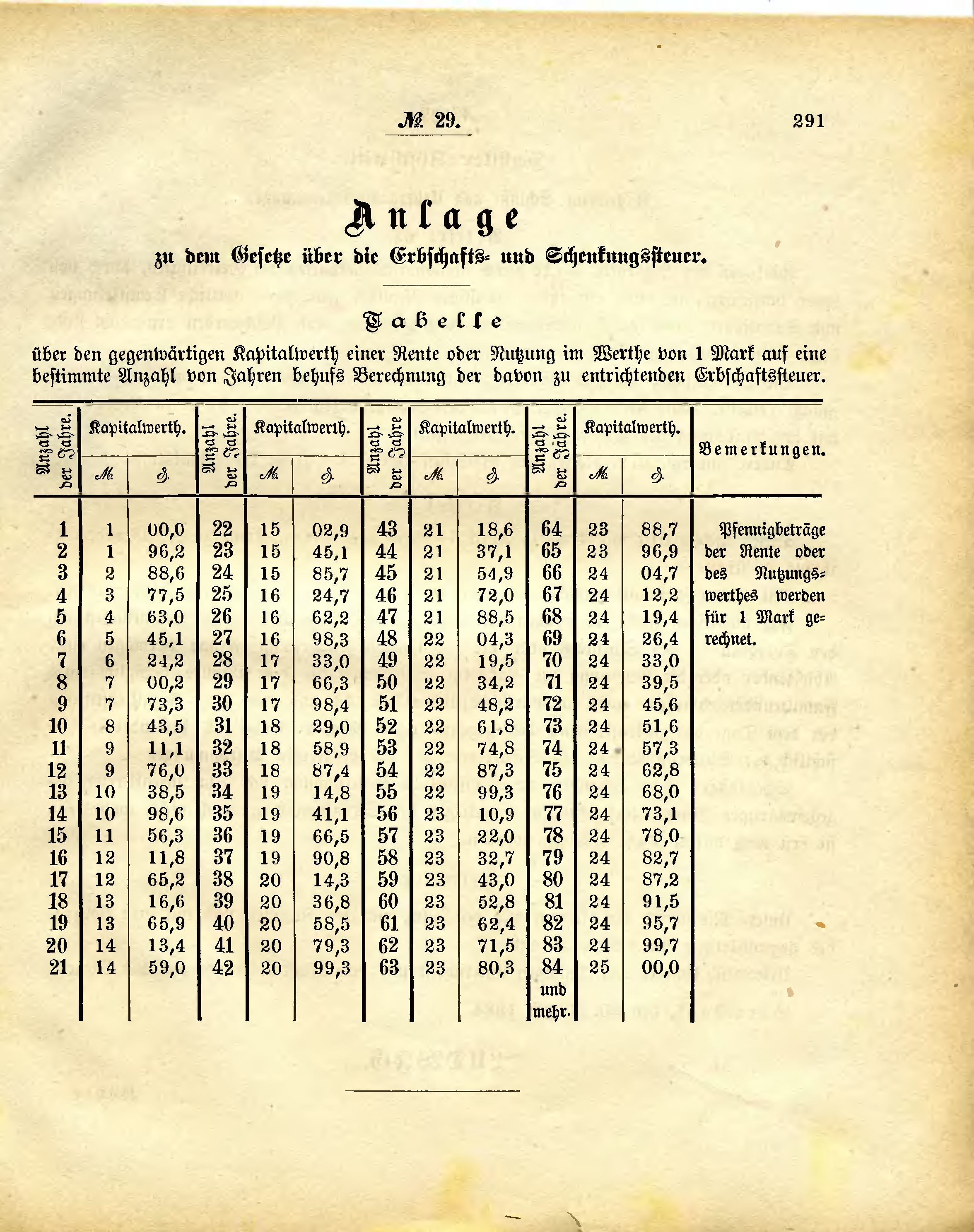 über den gegenwärtigen Kapitalwerth einer Rente oder Nutzung im Werthe von 1 Mark auf eine bestimmte Anzahl von Jahren behufs Berechnung der davon zu entrichtenden Erbschaftssteuer.