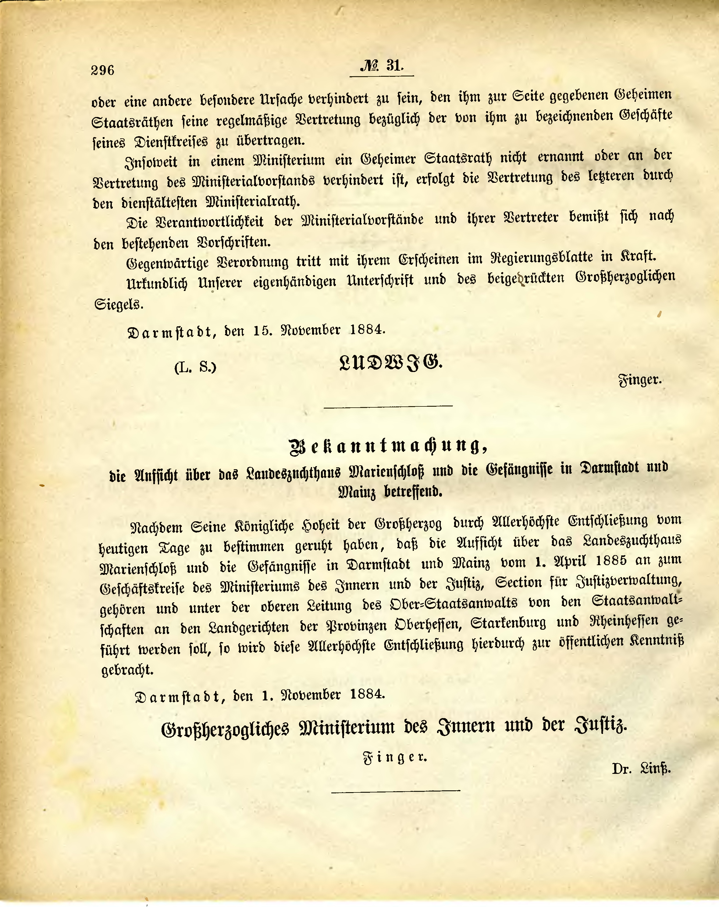 Nachdem Seine Königliche Hoheit der Großherzog durch Allerhöchste Entschließung vom heutigen Tage zu bestimmen geruht haben, daß die Aufsicht über das Landeszuchthaus Marienschloß und die Gefängnisse in Darmstadt und Mainz vom 1. April 1885 an zum Geschäftskreise des Ministeriums des Innern und der Justiz, Section für Justizverwaltung, gehören und unter der oberen Leitung des Ober-Staatsanwalts von den Staatsanwaltschaften an den Landgerichten der Provinzen Oberhessen, Starkenburg und Rheinhessen geführt werden soll, so wird diese Allerhöchste Entschließung hierdurch zur öffentlichen Kenntniß gebracht.