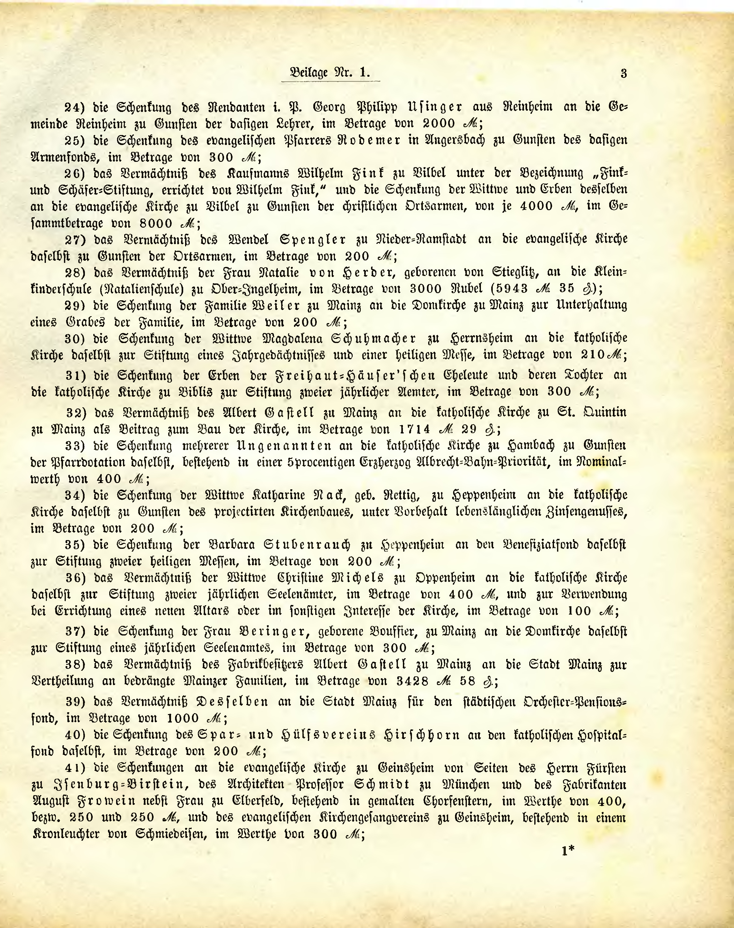 38) das Vermächtniß des Fabrikbesitzers Albert Gastell zu Mainz an die Stadt Mainz zur Vertheilung an bedrängte Mainzer Familien, im Betrage von 3428