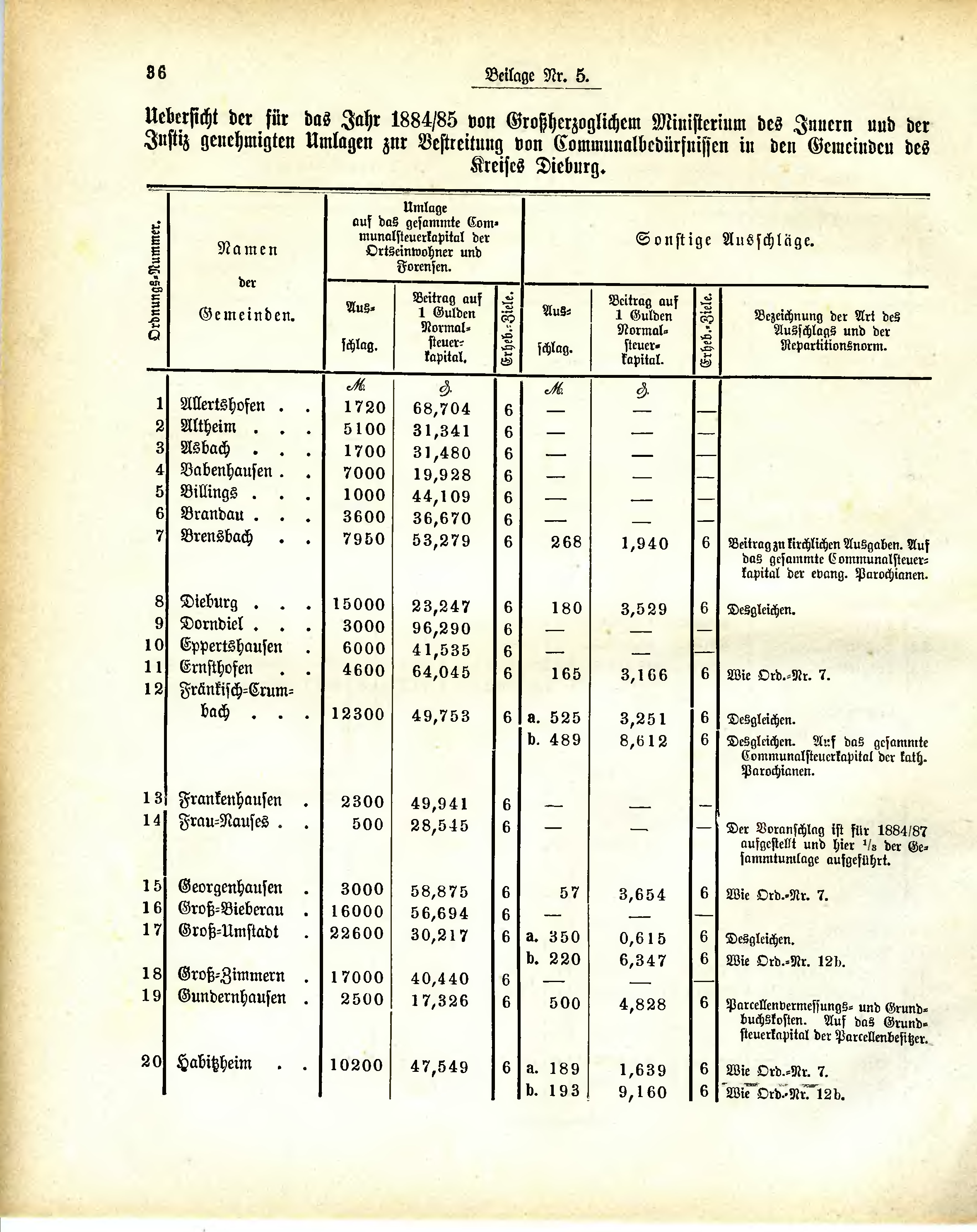 Uebersicht der für das Jahr 1884/85 von Großherzoglichem Ministerium des Innern und der Justiz genehmigten Umlagen zur Bestreitung von Communalbedürfnissen in den Gemeinden des Kreises Dieburg.