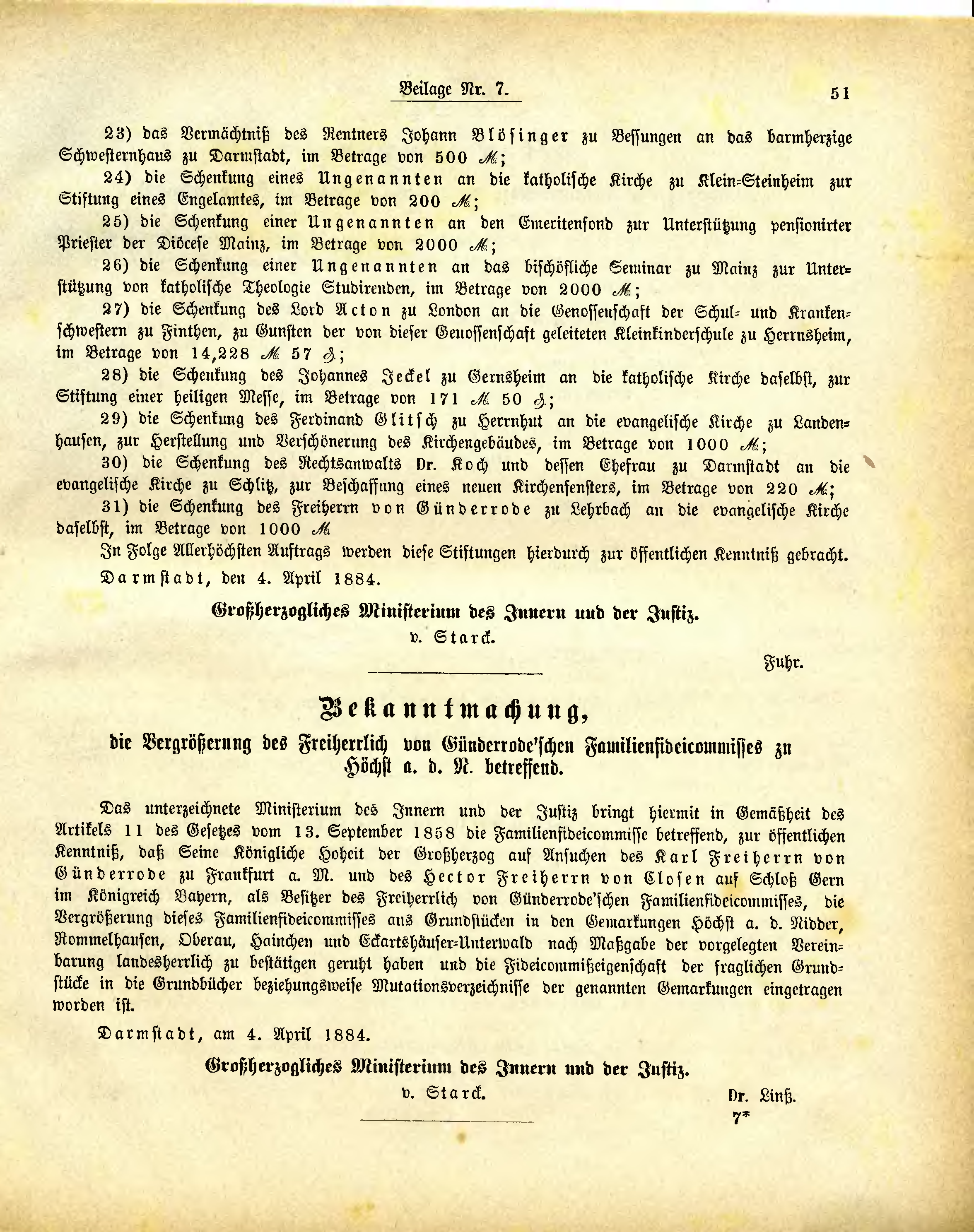 Das unterzeichnete Ministerium des Innern und der Justiz bringt hiermit in Gemäßheit des Artikels 11 des Gesetzes vom 13. September 1858 die Familienfideicommisse betreffend, zur öffentlichen Kenntniß, daß Seine Königliche Hoheit der Großherzog auf Ansuchen des Karl Freiherrn von Günderrode zu Frankfurt a. M. und des Hector Freiherrn von Closen auf Schloß Gern im Königreich Bayern, als Besitzer des Freiherrlich von Günderrode`schen Familienfideicommisses, die Vergrößerung dieses Familienfideicommisses aus Grundstücken in den Gemarkungen Höchst a. d. Nidder, Rommelhausen, Oberau, Hainchen und Eckartshäuser-Unterwald nach Maßgabe der vorgelegten Vereinbarung landesherrlich zu bestätigen geruht haben und die Fideicommißeigenschaft der fraglichen Grundstücke in die Grundbücher beziehungsweise Mutationsverzeichnisse der genannten Gemarkungen eingetragen worden ist.