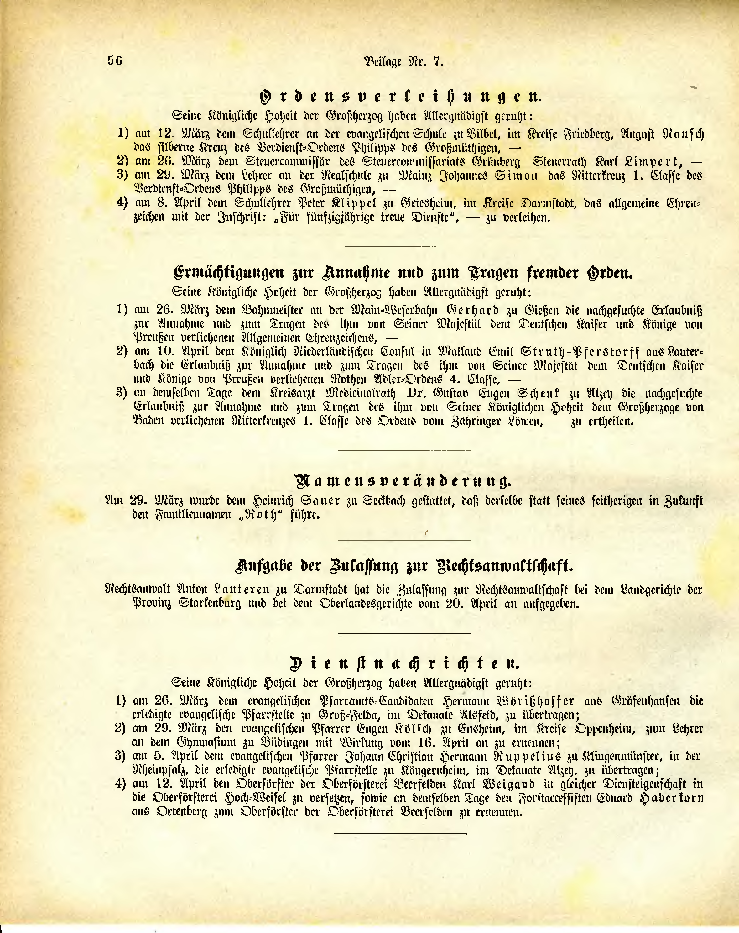 | 4) | am 8. April dem Schullehrer Peter Klippel zu Griesheim, im Kreise Darmstadt, das allgemeine Ehrenzeichen mit der Inschrift: "Für fünfzigjährige treue Dienste", - zu verleihen. |