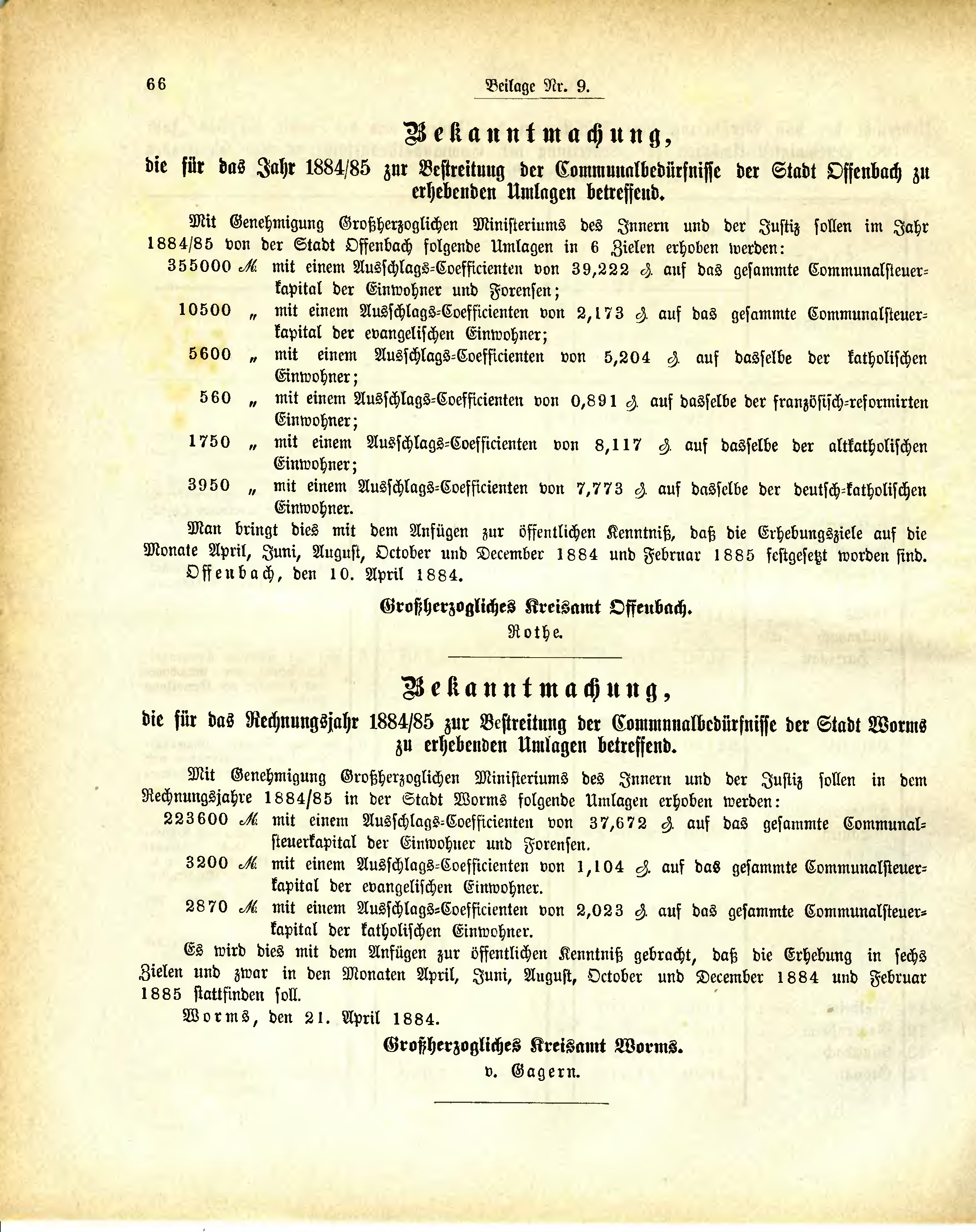 Mit Genehmigung Großherzoglichen Ministeriums des Innern und der Justiz sollen im Jahr 1884/85 von der Stadt Offenbach folgende Umlagen in 6 Zielen erhoben werden: