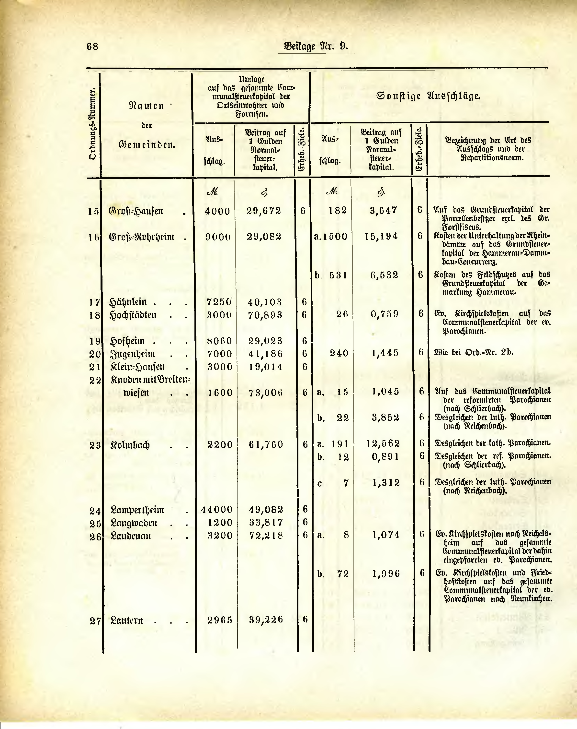 26 Laudenau 3200 72,218 6 a. 8 1,074 6 Ev. Kirchspielskosten nach Reichelsheim auf das gesammte Communalsteuerkapital der dahin eingepfarrten ev. Parochianen.