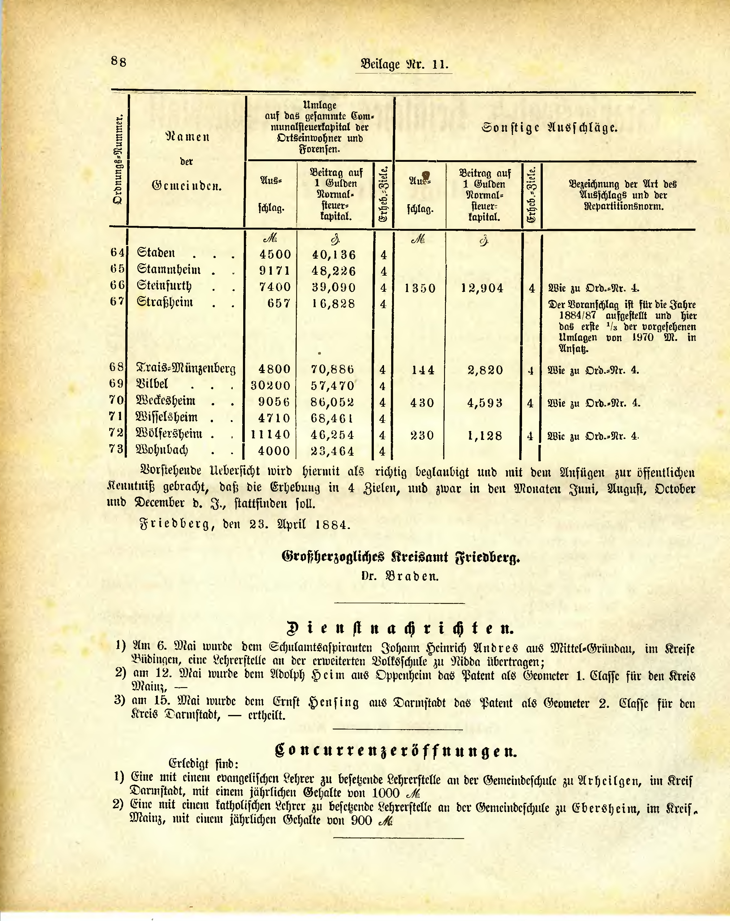 1) Am 6. Mai wurde dem Schulamtsaspiranten Johann Heinrich Andres aus Mittel-Gründau, im Kreise Büdingen, eine Lehrerstelle an der erweiterten Volksschule zu Nidda übertragen;