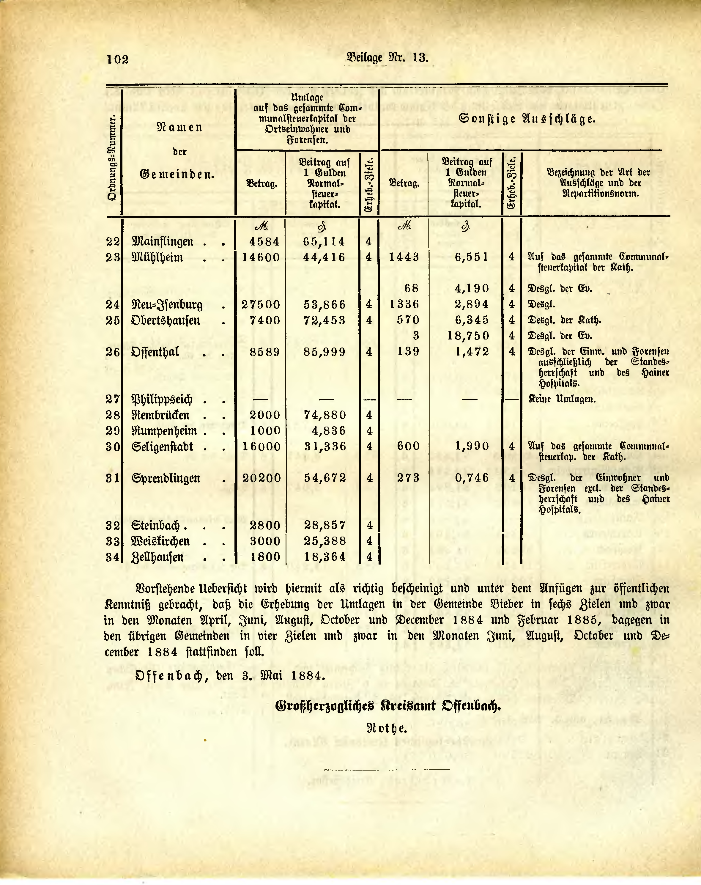 Vorstehende Uebersicht wird hiermit als richtig bescheinigt und unter dem Anfügen zur öffentlichen Kenntniß gebracht, daß die Erhebung der Umlagen in der Gemeinde Bieber in sechs Zielen und zwar in den Monaten April, Juni, August, October und December 1884 und Februar 1885, dagegen in den übrigen Gemeinden in vier Zielen und zwar in den Monaten Juni, August, October und December 1884 stattfinden soll.
