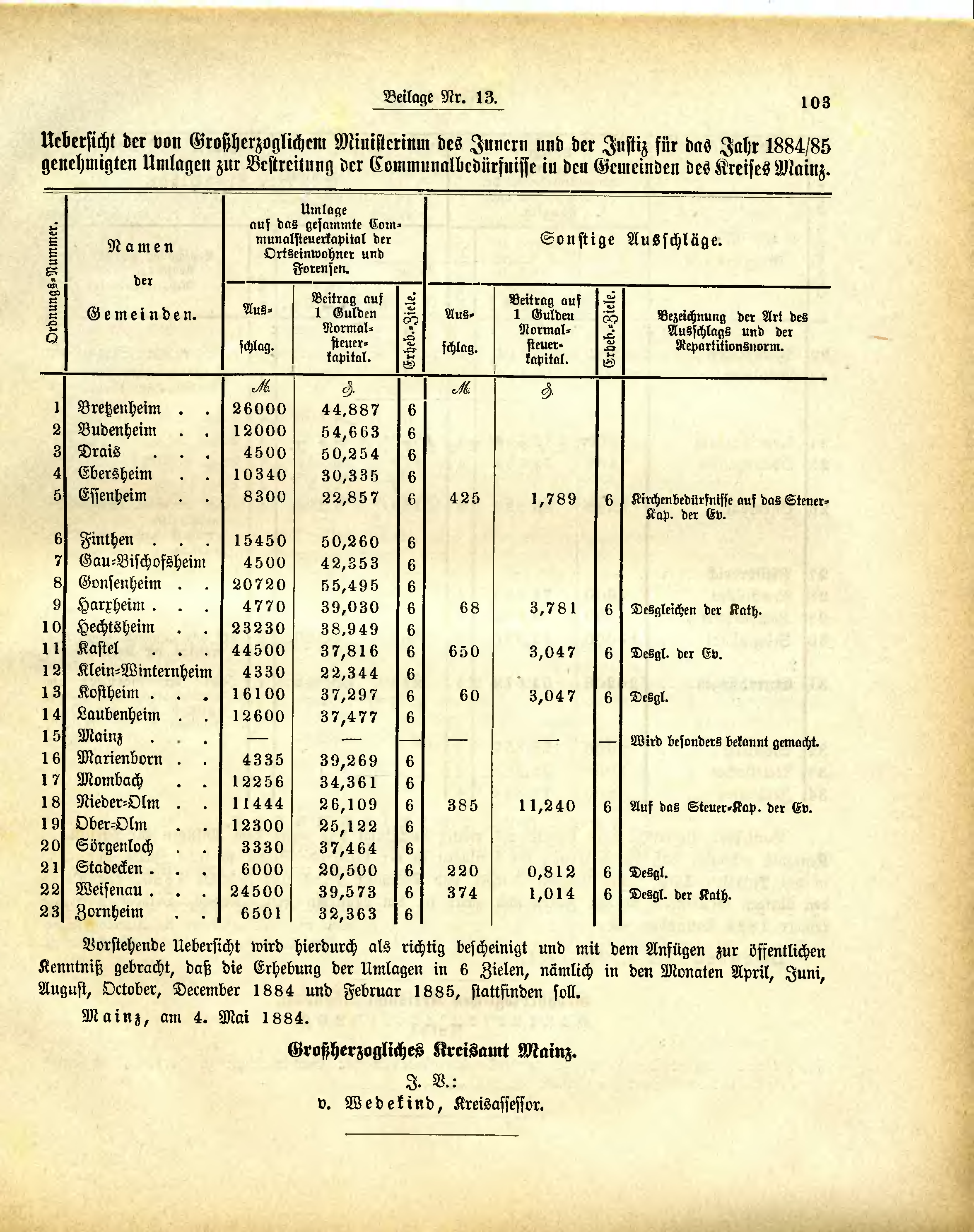 Uebersicht der von Großherzoglichem Ministerium des Innern und der Justiz für das Jahr 1884/85 genehmigten Umlagen zur Bestreitung der Communalbedürfnisse in den Gemeinden des Kreises Mainz.