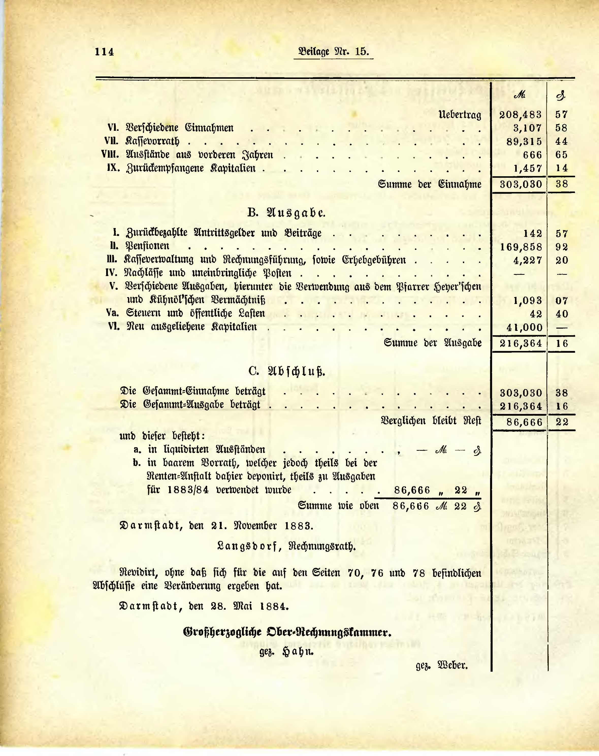 b. in baarem Vorrath, welcher jedoch theils bei der Renten-Anstalt dahier deponirt, theils zu Ausgaben für 1883/84 verwendet wurde 86,666 " 22 "