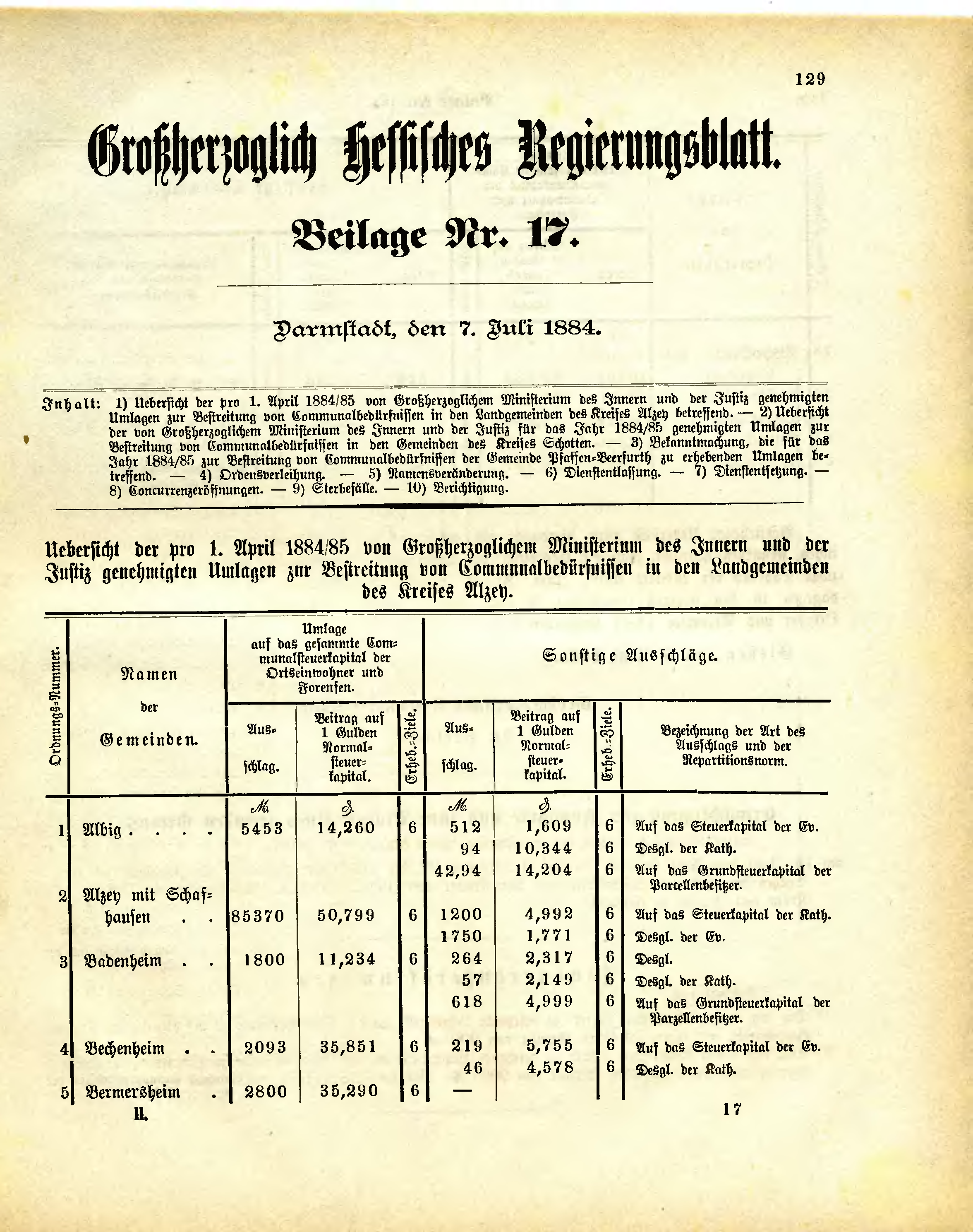 Inhalt: 1) Uebersicht der pro 1. April 1884/85 von Großherzoglichem Ministerium des Innern und der Justiz genehmigten Umlagen zur Bestreitung von Communalbedürfnissen in den Landgemeinden des Kreises Alzey betreffend. - 2) Uebersicht der von Großherzoglichem Ministerium des Innern und der Justiz für das Jahr 1884/85 genehmigten Umlagen zur Bestreitung von Communalbedürfnissen in den Gemeinden des Kreises Schotten. - 3) Bekanntmachung, die für das Jahr 1884/85 zur Bestreitung von Communalbedürfnissen der Gemeinde Pfaffen-Beerfurth zu erhebenden Umlagen betreffend. - 4) Ordensverleihung. - 5) Namensveränderung. - 6) Dienstentlassung. - 7) Dienstentsetzung. - 8) Concurrenzeröffnungen. - 9) Sterbefälle. - 10) Berichtigung.