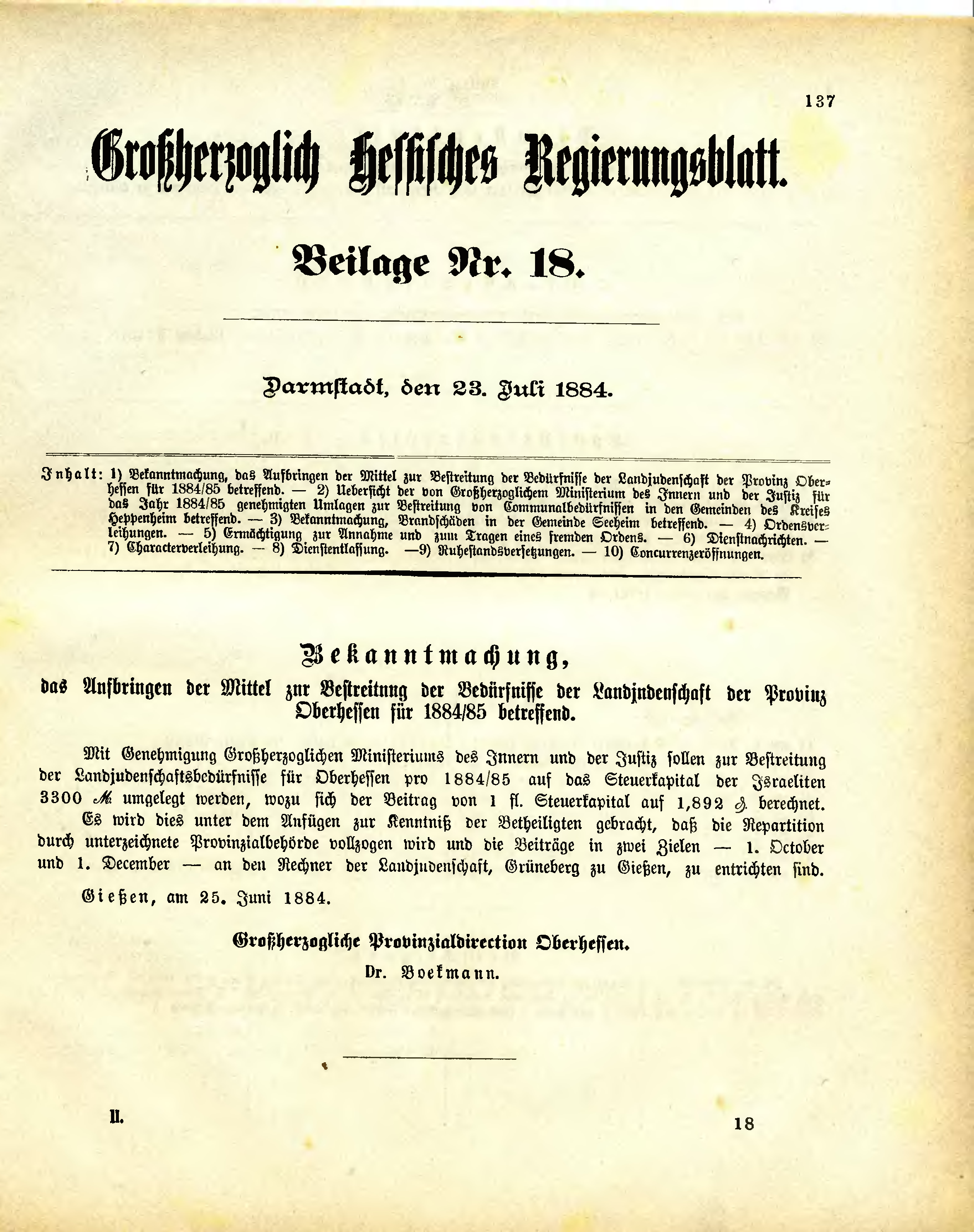 Mit Genehmigung Großherzoglichen Ministeriums des Innern und der Justiz sollen zur Bestreitung der Landjudenschaftsbedürfnisse für Oberhessen pro 1884/85 auf das Steuerkapital der Israeliten 3300