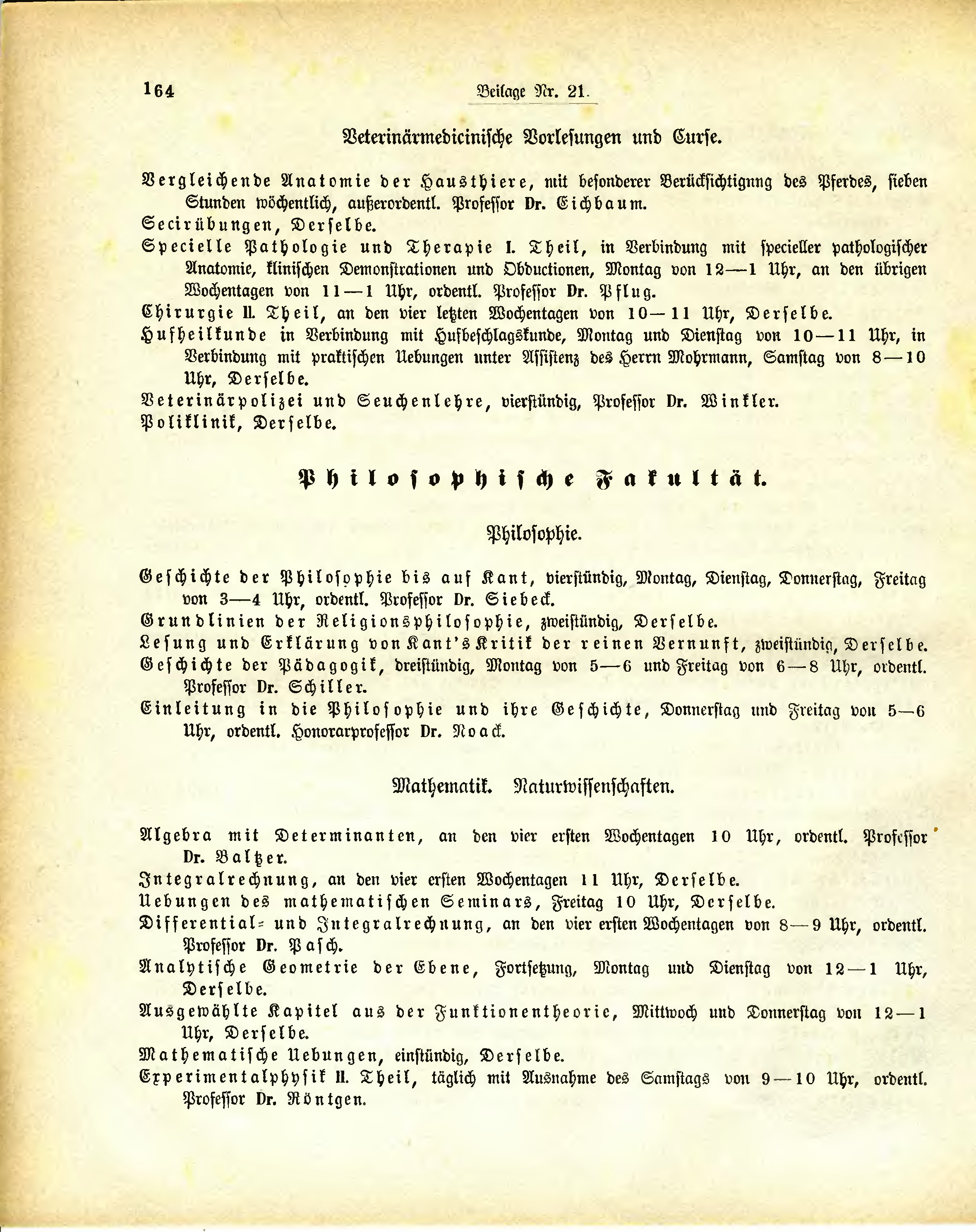 Experimentalphysik II. Theil, täglich mit Ausnahme des Samstags von 9-10 Uhr, ordentl. Professor Dr. Röntgen.