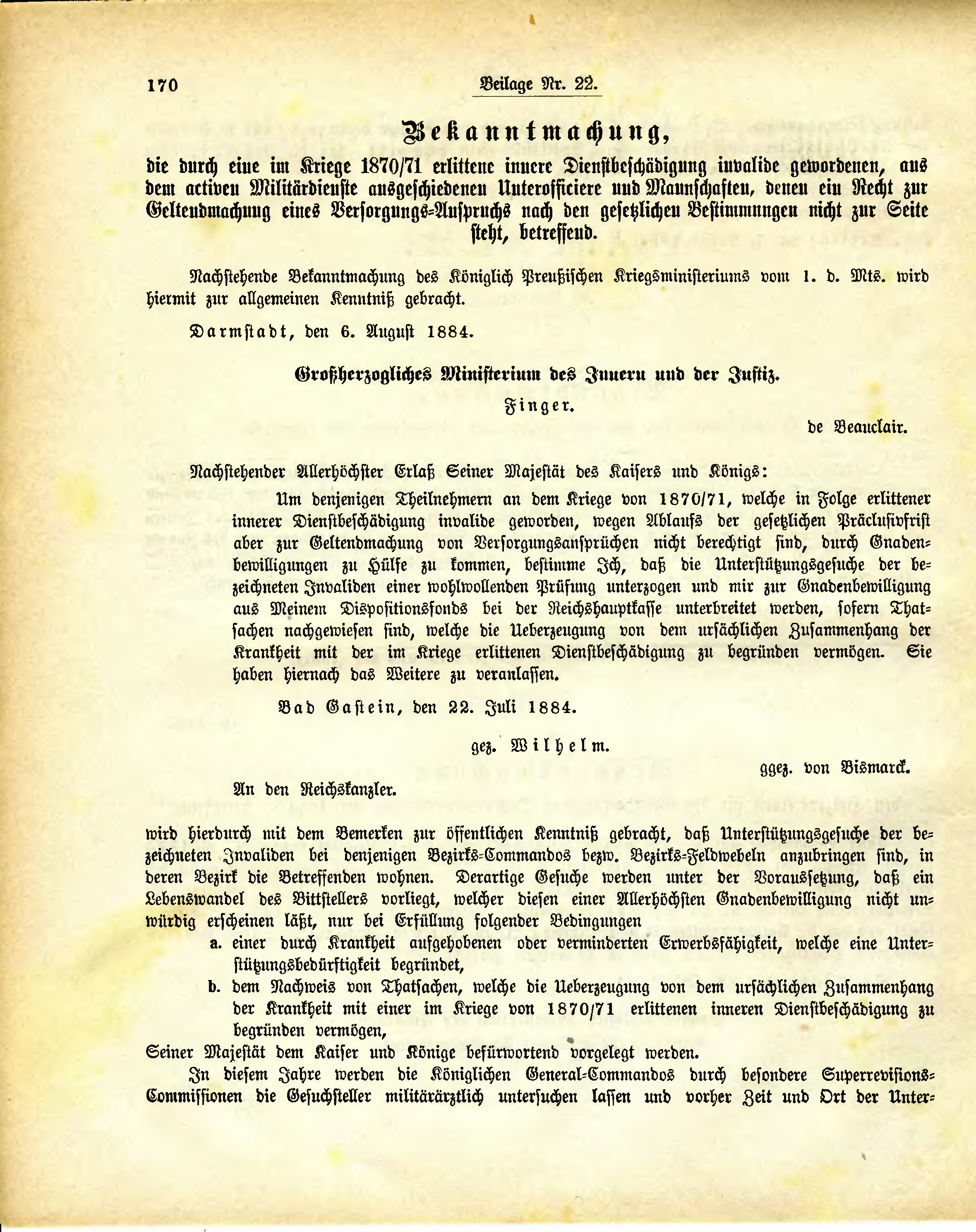 Um denjenigen Theilnehmern an dem Kriege von 1870/71, welche in Folge erlittener innerer Dienstbeschädigung invalide geworden, wegen Ablaufs der gesetzlichen Präclusivfrist aber zur Geltendmachung von Versorgungsansprüchen nicht berechtigt sind, durch Gnadenbewilligungen zu Hülfe zu kommen, bestimme Ich, daß die Unterstützungsgesuche der bezeichneten Invaliden einer wohlwollenden Prüfung unterzogen und mir zur Gnadenbewilligung aus Meinem Dispositionsfonds bei der Reichshauptkasse unterbreitet werden, sofern Thatsachen nachgewiesen sind, welche die Ueberzeugung von dem ursächlichen Zusammenhang der Krankheit mit der im Kriege erlittenen Dienstbeschädigung zu begründen vermögen. Sie haben hiernach das Weitere zu veranlassen.