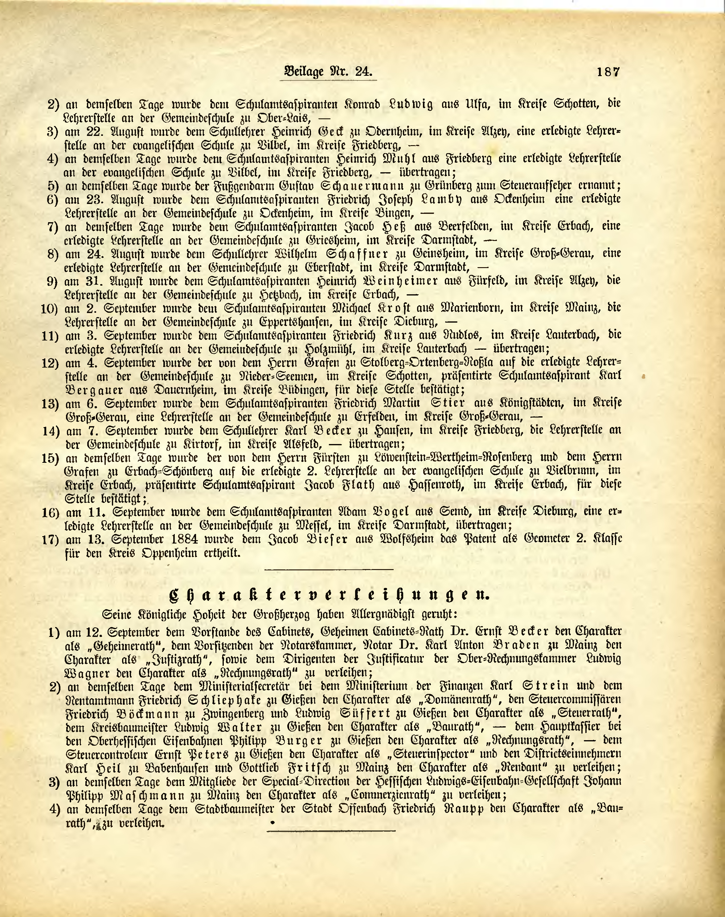 | 2) | an demselben Tage dem Ministerialsecretär bei dem Ministeriumder Finanzen Karl Strein und dem Rentamtmann Friedrich Schliephake zu Gießen den Charakter als "Domänenrath", den Steuercommissären Friedrich Böckmann zu Zwingenberg und Ludwig Süffert zu Gießen den Charakter als "Steuerrath", dem Kreisbaumeister Ludwig Walter zu Gießen den Charakter als "Baurath", - dem Hauptkassier bei den Oberhessischen Eisenbahnen Philipp Burger zu Gießen den Charakter als "Rechnungsrath", - dem Steuercontroleur Ernst Peters zu Gießen den Charakter als "Steuerinspector" und den Districtseinnehmern Karl Heil zu Babenhausen und Gottlieb Fritsch zu Mainz den Charakter als "Rendant" zu verleihen; |