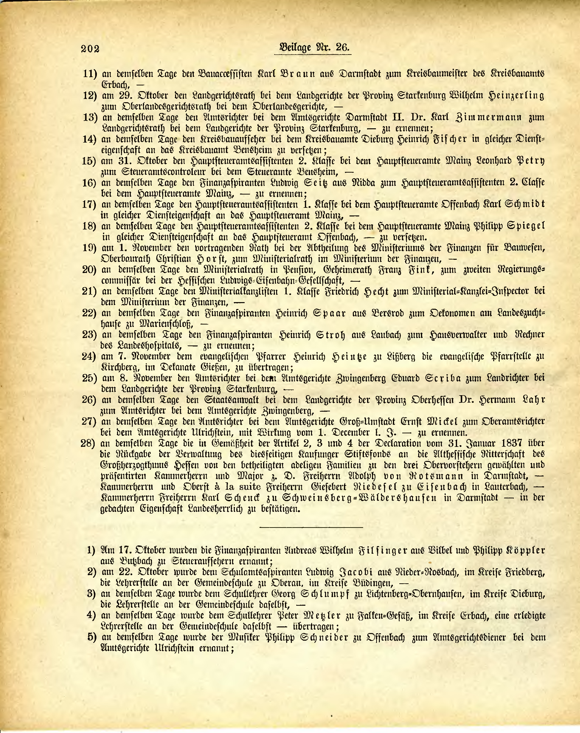 | 25) | am 8. November den Amtsrichter bei dem Amtsgerichte Zwingenberg Eduard Scriba zum Landrichter bei dem Landgerichte der Provinz Starkenburg, - |