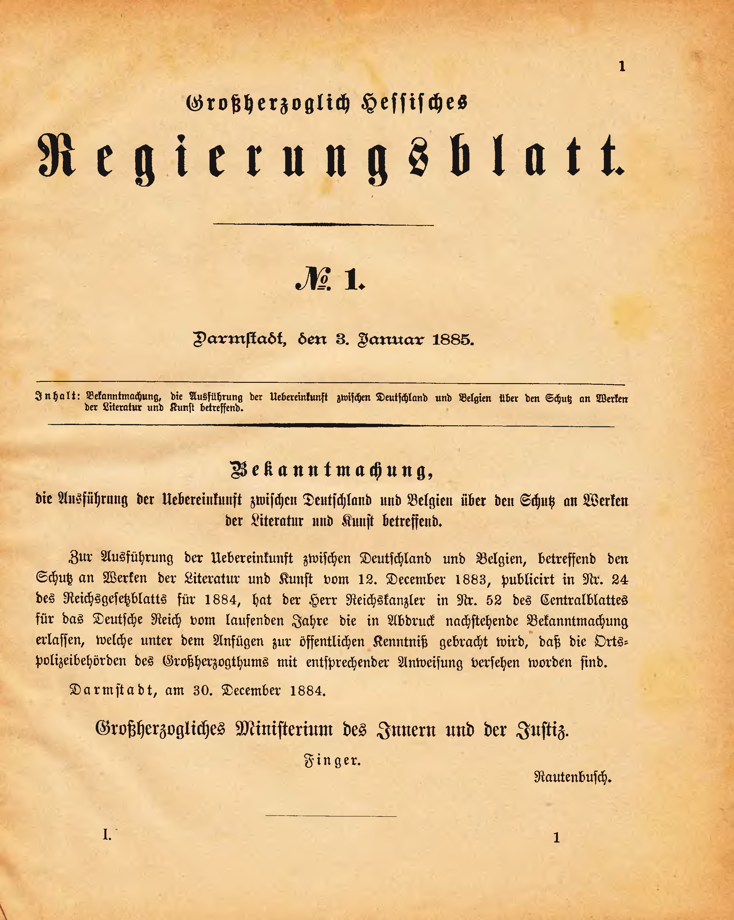Zur Ausführung der Uebereinkunft zwischen Deutschland und Belgien, betreffend den Schutz an Werken der Literatur und Kunst vom 12. December 1883, publicirt in Nr. 24 des Reichsgesetzblatts für 1884, hat der Herr Reichskanzler in Nr. 52 des Centralblattes für das Deutsche Reich vom laufenden Jahre die in Abdruck nachstehende Bekanntmachung erlassen, welche unter dem Anfügen zur öffentlichen Kenntniß gebracht wird, daß die Ortspolizeibehörden des Großherzogthums mit entsprechender Anweisung versehen worden sind.