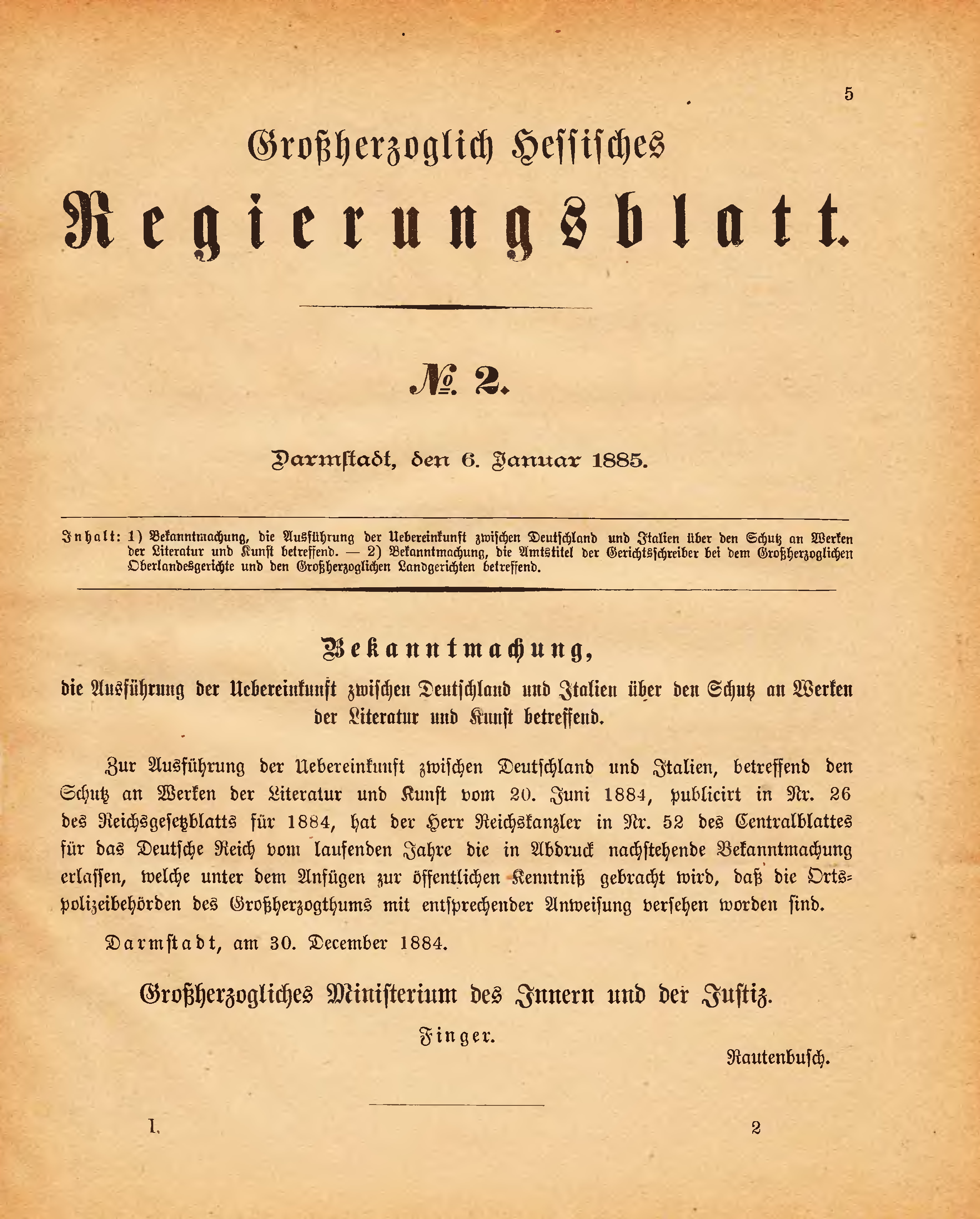 Zur Ausführung der Uebereinkunft zwischen Deutschland und Italien, betreffend den Schutz an Werken der Literatur und Kunst vom 20. Juni 1884, publicirt in Nr. 26 des Reichsgesetzblatts für 1884, hat der Herr Reichskanzler in Nr. 52 des Centralblattes für das Deutsche Reich vom laufenden Jahre die in Abdruck nachstehende Bekanntmachung erlassen, welche unter dem Anfügen zur öffentlichen Kenntniß gebracht wird, daß die Ortspolizeibehörden des Großherzogthums mit entsprechender Anweisung versehen worden sind.