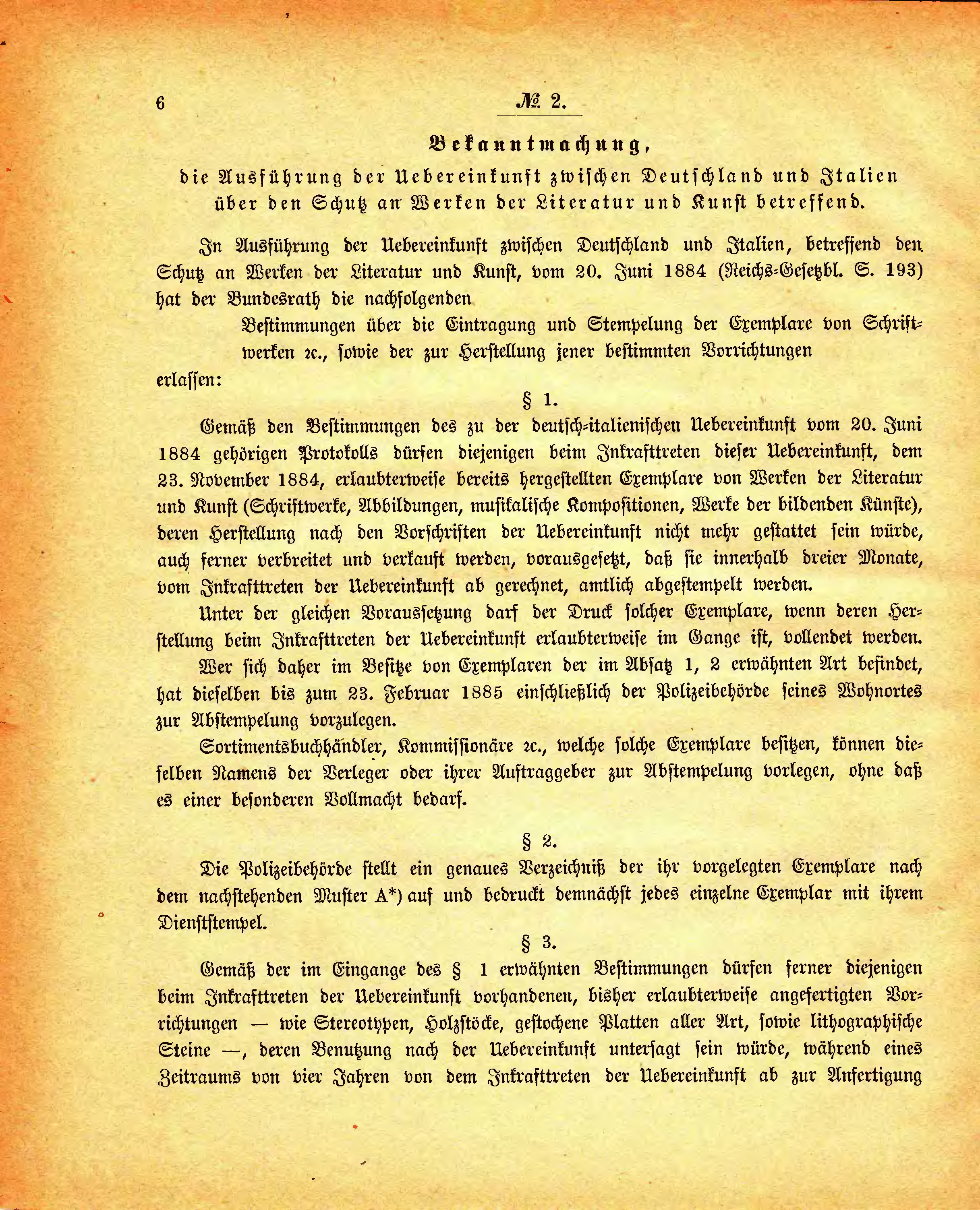 Gemäß den Bestimmungen des zu der deutsch-italienischen Uebereinkunft vom 20. Juni 1884 gehörigen Protokolls dürfen diejenigen beim Inkrafttreten dieser Uebereinkunft, dem 23. November 1884, erlaubterweise bereits hergestellten Exemplare von Werken der Literatur und Kunst (Schriftwerke, Abbildungen, musikalische Kompositionen, Werke der bildenden Künste), deren Herstellung nach den Vorschriften der Uebereinkunft nicht mehr gestattet sein würde, auch ferner verbreitet und verkauft werden, vorausgesetzt, daß sie innerhalb dreier Monate, vom Inkrafttreten der Uebereinkunft ab gerechnet, amtlich abgestempelt werden.