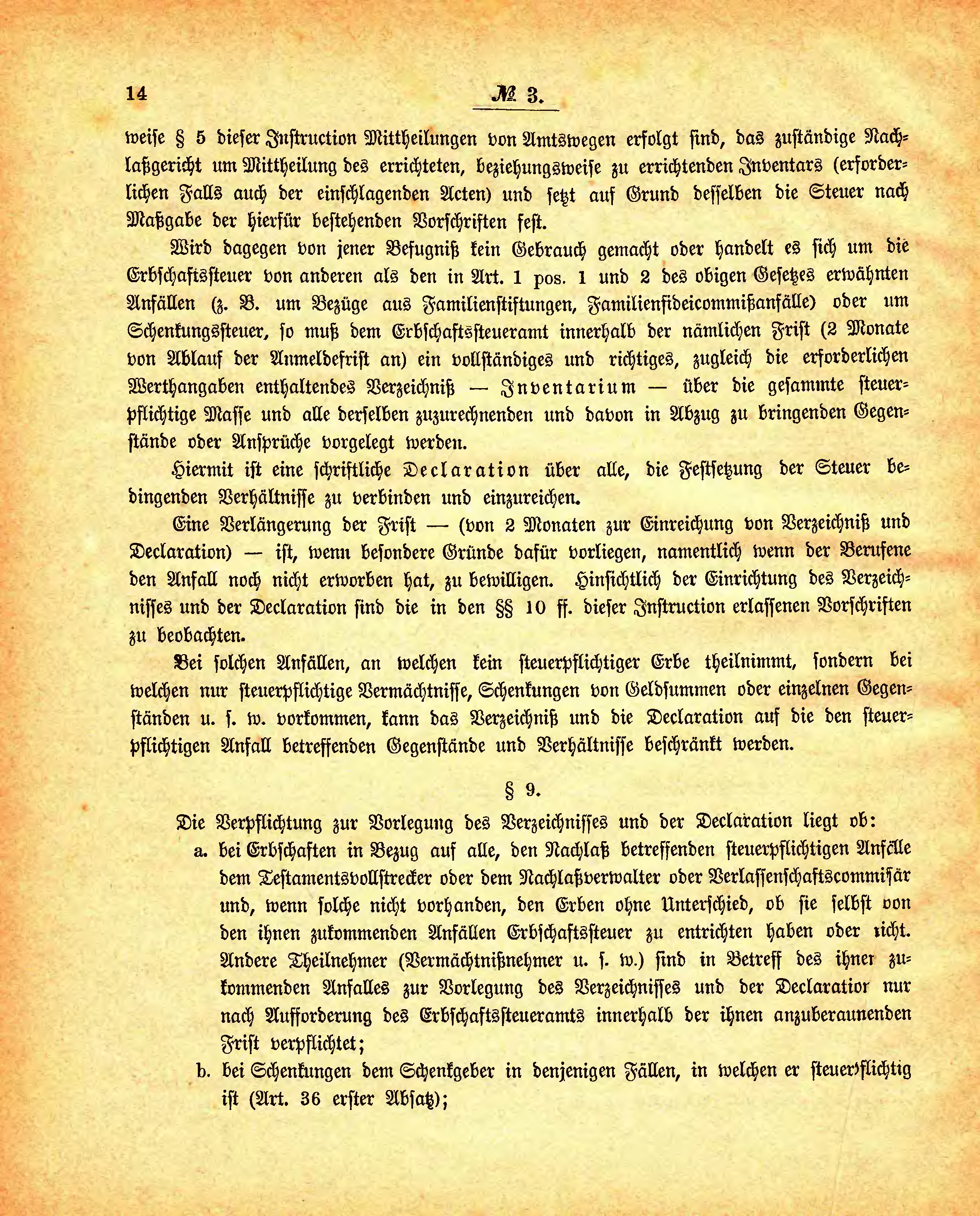Wird dagegen von jener Befugniß kein Gebrauch gemacht oder handelt es sich um die Erbschaftssteuer von anderen als den in Art. 1 pos. 1 und 2 des obigen Gesetzes erwähnten Anfällen (z. B. um Bezüge aus Familienstiftungen, Familienfideicommißanfälle) oder um Schenkungssteuer, so muß dem Erbschaftssteueramt innerhalb der nämlichen Frist (2 Monate von Ablauf der Anmeldefrist an) ein vollständiges und richtiges, zugleich die erforderlichen Werthangaben enthaltendes Verzeichniß - Inventarium - über die gesammte steuerpflichtige Masse und alle derselben zuzurechnenden und davon in Abzug zu bringenden Gegenstände oder Ansprüche vorgelegt werden.