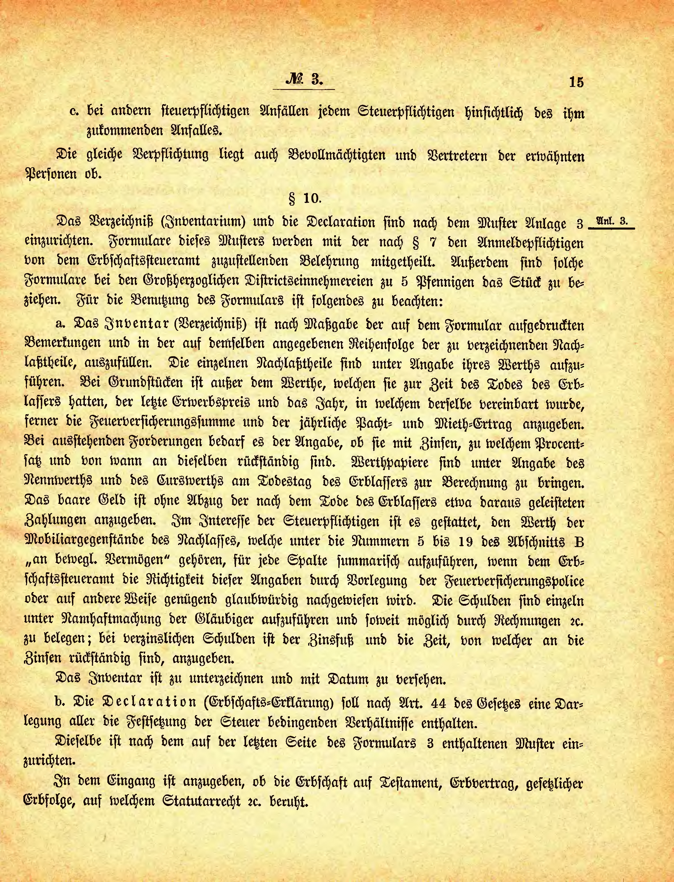 | Das Verzeichniß (Inventarium) und die Declaration sind nach dem Muster Anlage 3 einzurichten. Formulare dieses Musters werden mit der nach § 7 den Anmeldepflichtigen von dem Erbschaftssteueramt zuzustellenden Belehrung mitgetheilt. Außerdem sind solche Formulare bei den Großherzoglichen Districtseinnehmereien zu 5 Pfennigen das Stück zu beziehen. Für die Benutzung des Formulars ist folgendes zu beachten: a. Das Inventar (Verzeichniß) ist nach Maßgabe der auf dem Formular aufgedruckten Bemerkungen und in der auf demselben angegebenen Reihenfolge der zu verzeichnenden Nachlaßtheile, auszufüllen. Die einzelnen Nachlaßtheile sind unter Angabe ihres Werths aufzuführen. Bei Grundstücken ist außer dem Werthe, welchen sie zur Zeit des Todes des Erblassers hatten, der letzte Erwerbspreis und das Jahr, in welchem derselbe vereinbart wurde, ferner die Feuerversicherungssumme und der jährliche Pacht- und Mieth-Ertrag anzugeben. Bei ausstehenden Forderungen bedarf es der Angabe, ob sie mit Zinsen, zu welchem Procentsatz und von wann an dieselben rückständig sind. Werthpapiere sind unter Angabe des Nennwerths und des Curswerths am Todestag des Erblassers zur Berechnung zu bringen. Das baare Geld ist ohne Abzug der nach dem Tode des Erblassers etwa daraus geleisteten Zahlungen anzugeben. Im Interesse der Steuerpflichtigen ist es gestattet, den Werth der Mobiliargegenstände des Nachlasses, welche unter die Nummern 5 bis 19 des Abschnitts B "an bewegl. Vermögen" gehören, für jede Spalte summarisch auszuführen, wenn dem Erbschaftssteueramt die Richtigkeit dieser Angaben durch Vorlegung der Feuerversicherungspolice oder auf andere Weise genügend glaubwürdig nachgewiesen wird. Die Schulden sind einzeln unter Namhaftmachung der Gläubiger auszuführen und soweit möglich durch Rechnungen etc. zu belegen; bei verzinslichen Schulden ist der Zinsfuß und die Zeit, von welcher an die Zinsen rückständig sind, anzugeben. |
