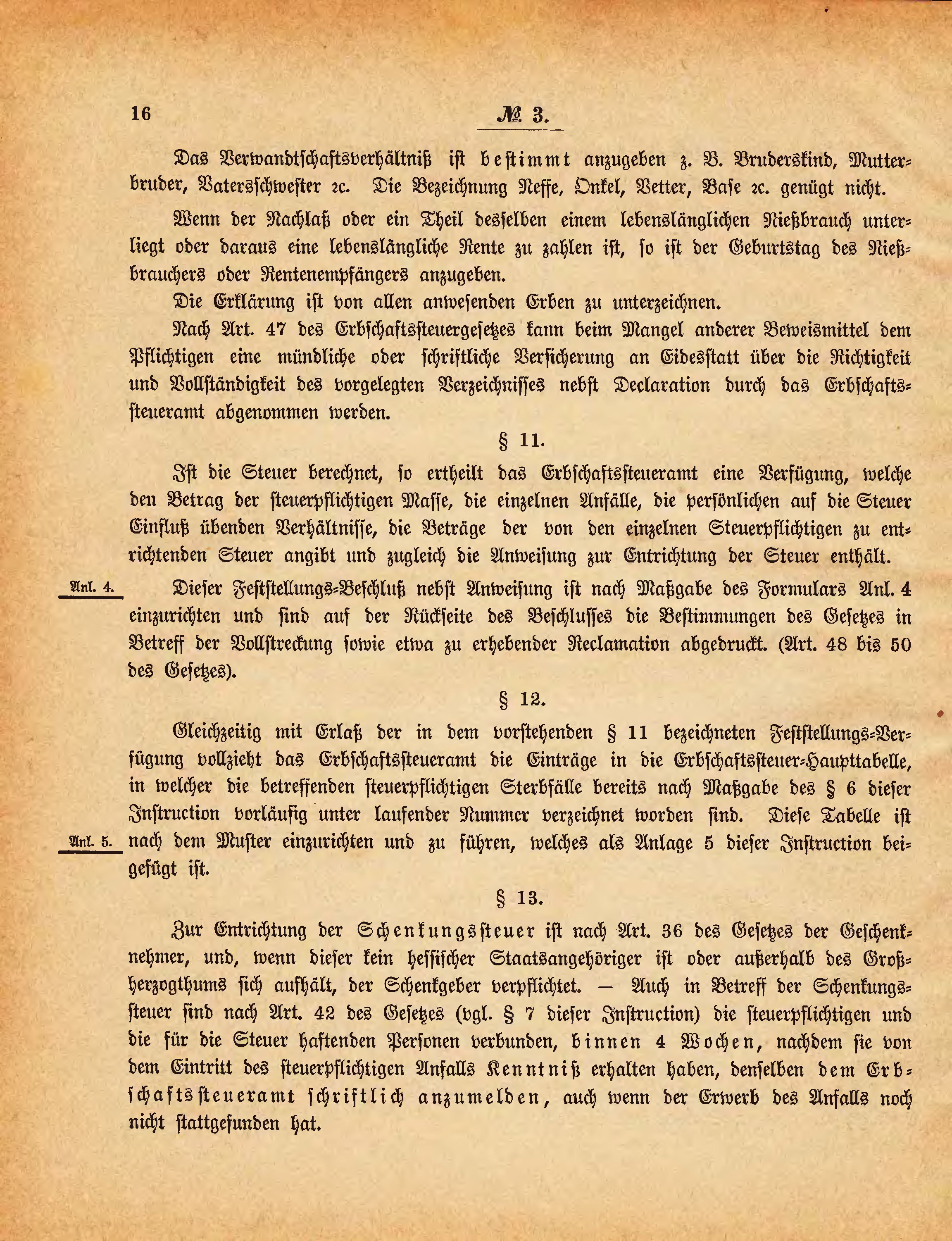 | Zur Entrichtung der Schenkungssteuer ist nach Art. 36 des Gesetzes der Geschenknehmer, und, wenn dieser kein hessischer Staatsangehöriger ist oder außerhalb des Großherzogthums sich aufhält, der Schenkgeber verpflichtet. - Auch in Betreff der Schenkungssteuer sind nach Art. 42 des Gesetzes (vgl. § 7 dieser Instruction) die steuerpflichtigen und die für die Steuer haftenden Personen verbunden, binnen 4 Wochen, nachdem sie von dem Eintritt des steuerpflichtigen Anfalls Kenntniß erhalten haben, denselben dem Erbschaftssteueramt schriftlich anzumelden, auch wenn der Erwerb des Anfalls noch nicht stattgefunden hat. |