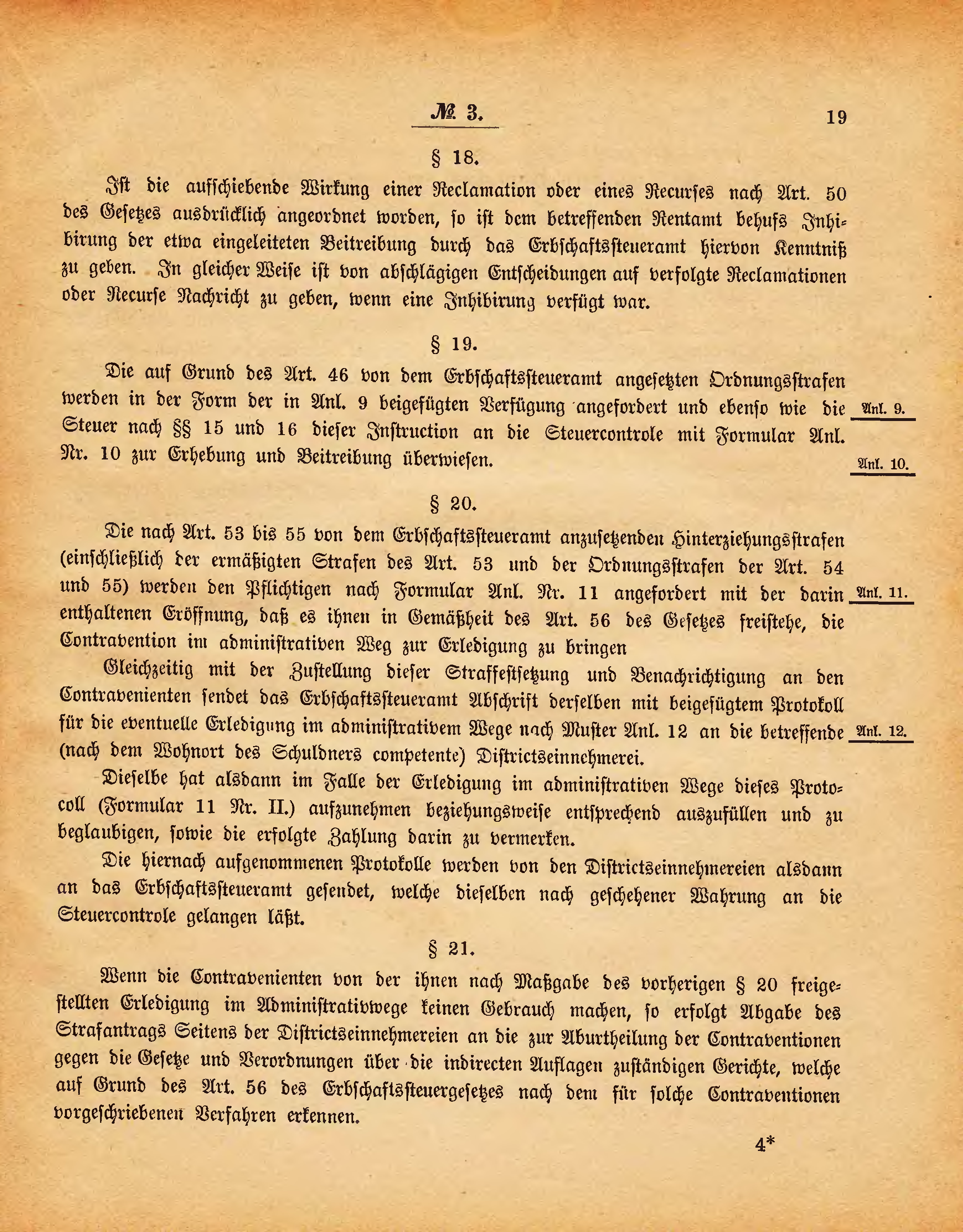 Die auf Grund des Art. 46 von dem Erbschaftssteueramt angesetzten Ordnungsstrafen werden in der Form der in Anl. 9 beigefügten Verfügung angefordert und ebenso wie die Steuer nach §§ 15 und 16 dieser Instruction an die Steuercontrole mit Formular Anl. Nr. 10 zur Erhebung und Beitreibung überwiesen.