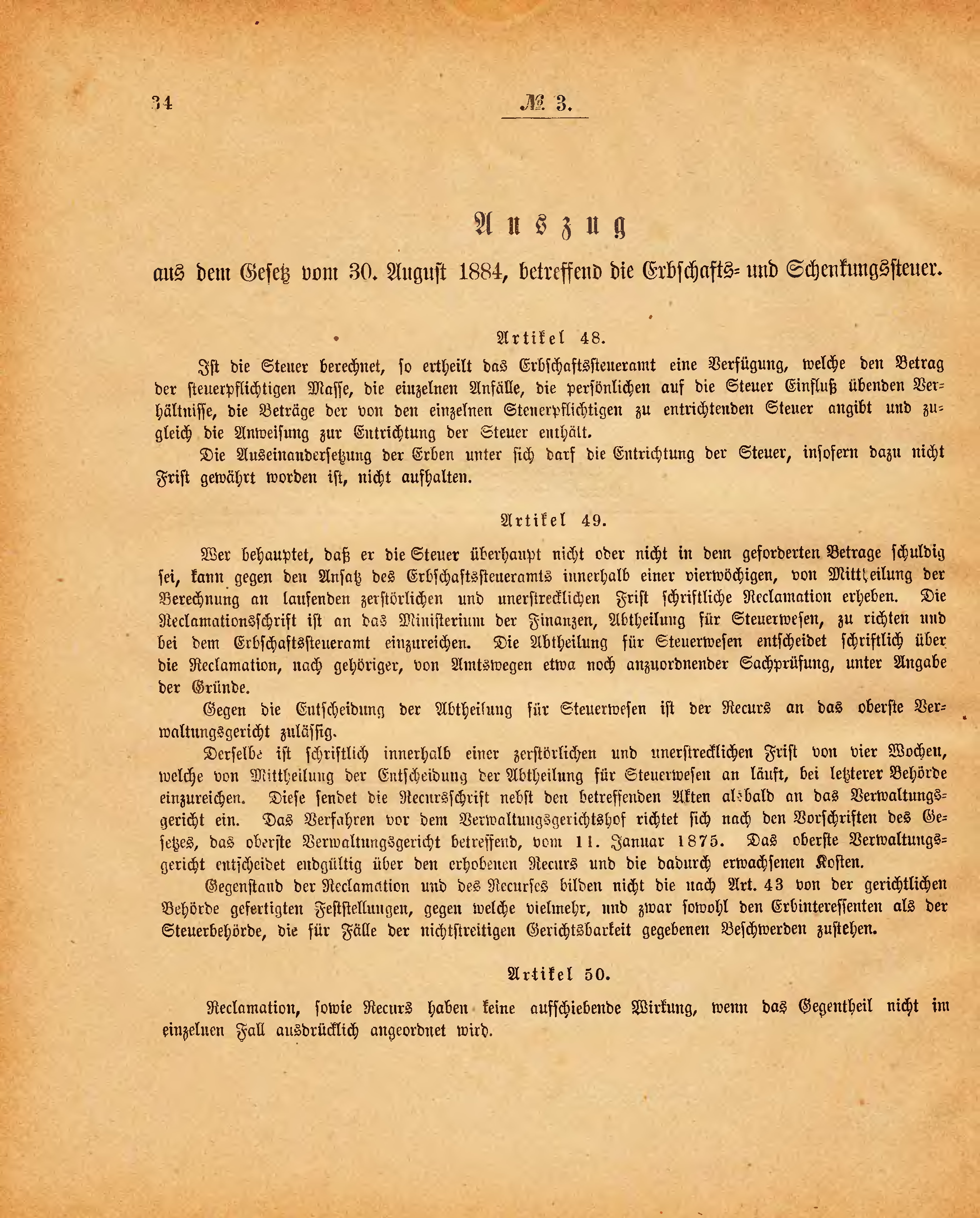 aus dem Gesetz vom 30. August 1884, betreffend die Erbschafts- und Schenkungssteuer.