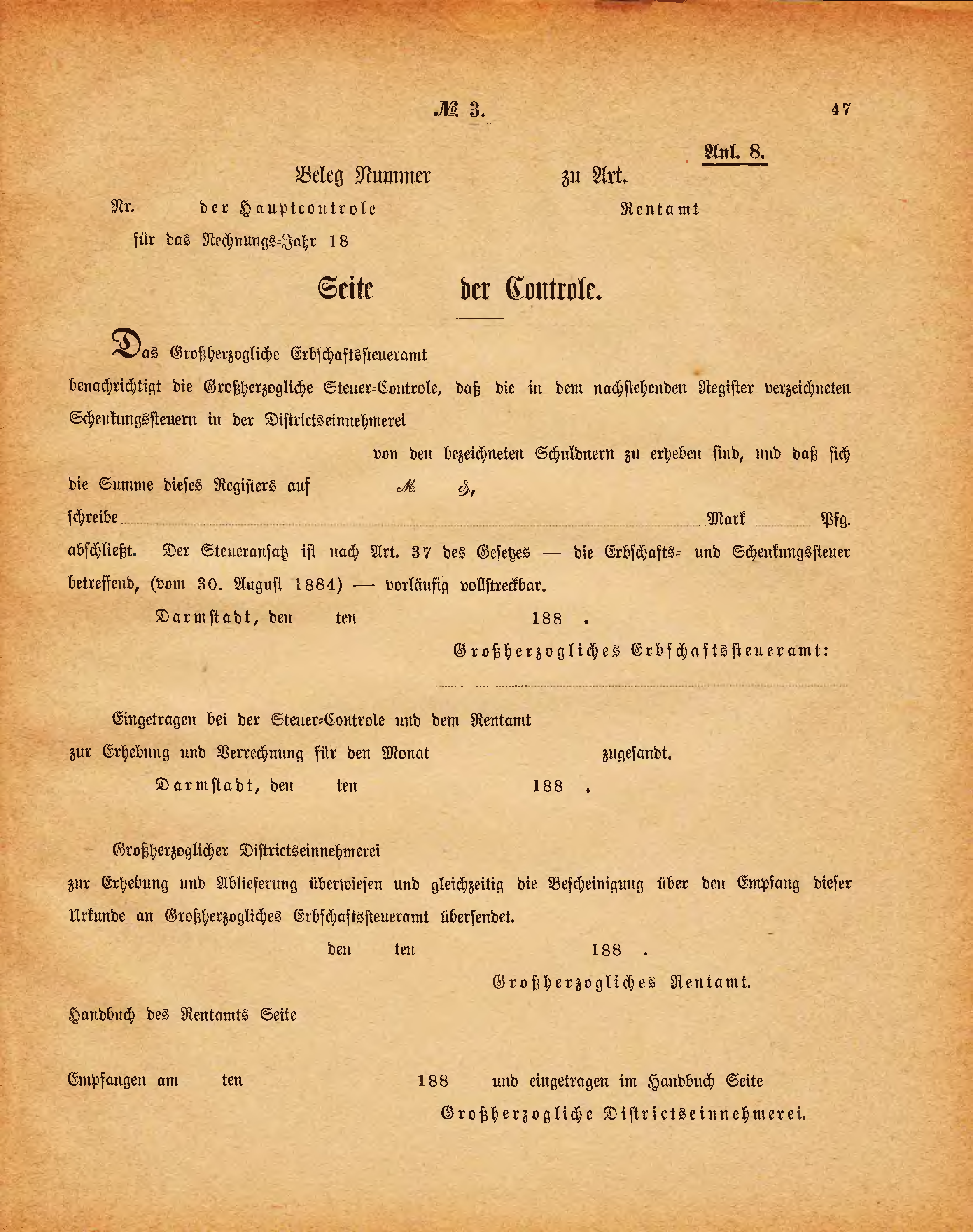 benachrichtigt die Großherzogliche Steuer-Controle, daß die in dem nachstehenden Register verzeichneten Schenkungssteuern durch die Districtseinnehmerei …………………………………………………… von den bezeichneten Schuldnern zu erheben sind, und daß sich die Summe dieses Registers auf ……….