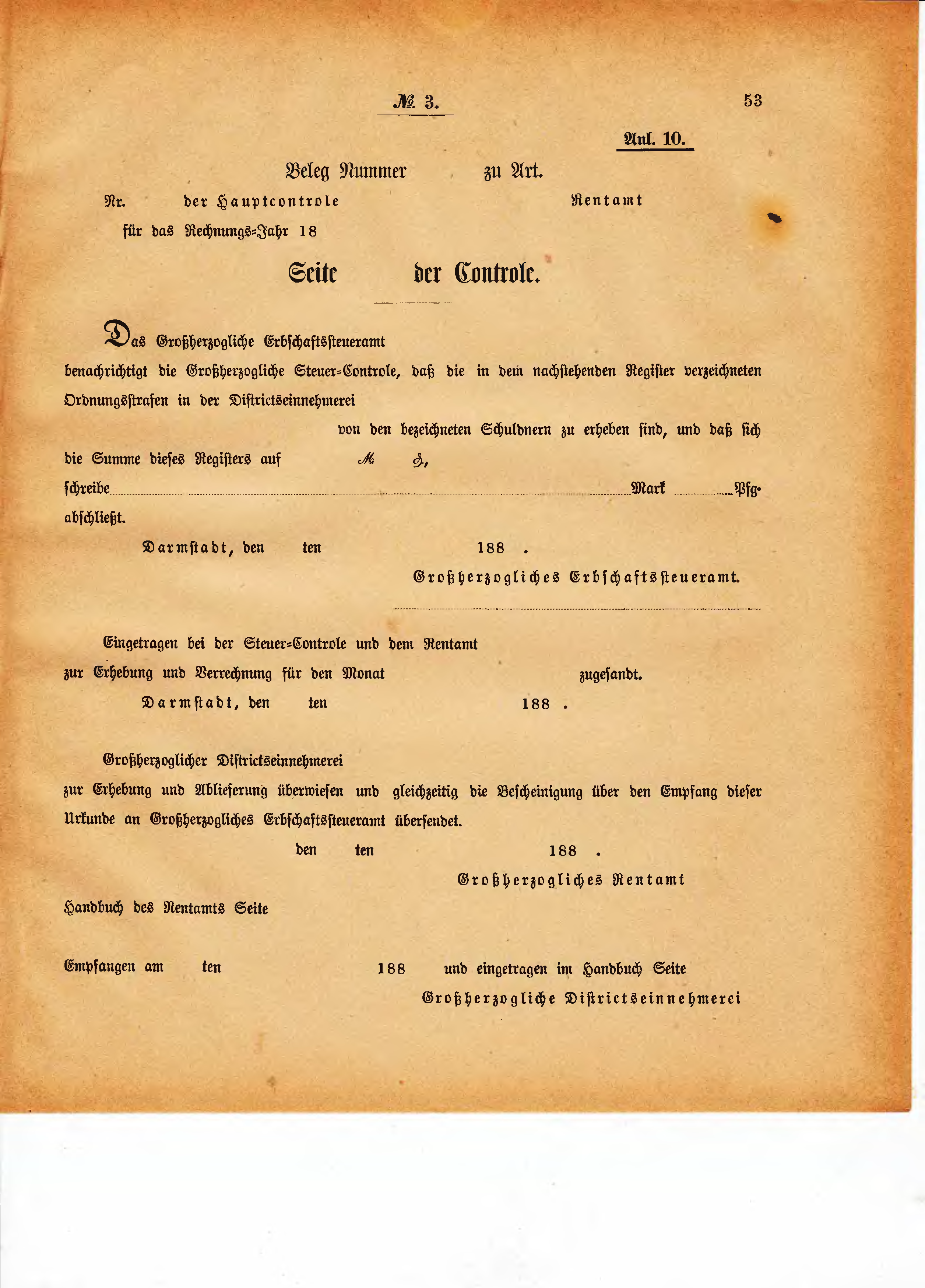 benachrichtigt die Großherzogliche Steuer-Controle, daß die in dem nachstehenden Register verzeichneten Ordnungsstrafen durch die Districtseinnehmerei …………………………………………………… von den bezeichneten Schuldnern zu erheben sind, und daß sich die Summe dieses Registers auf ……….