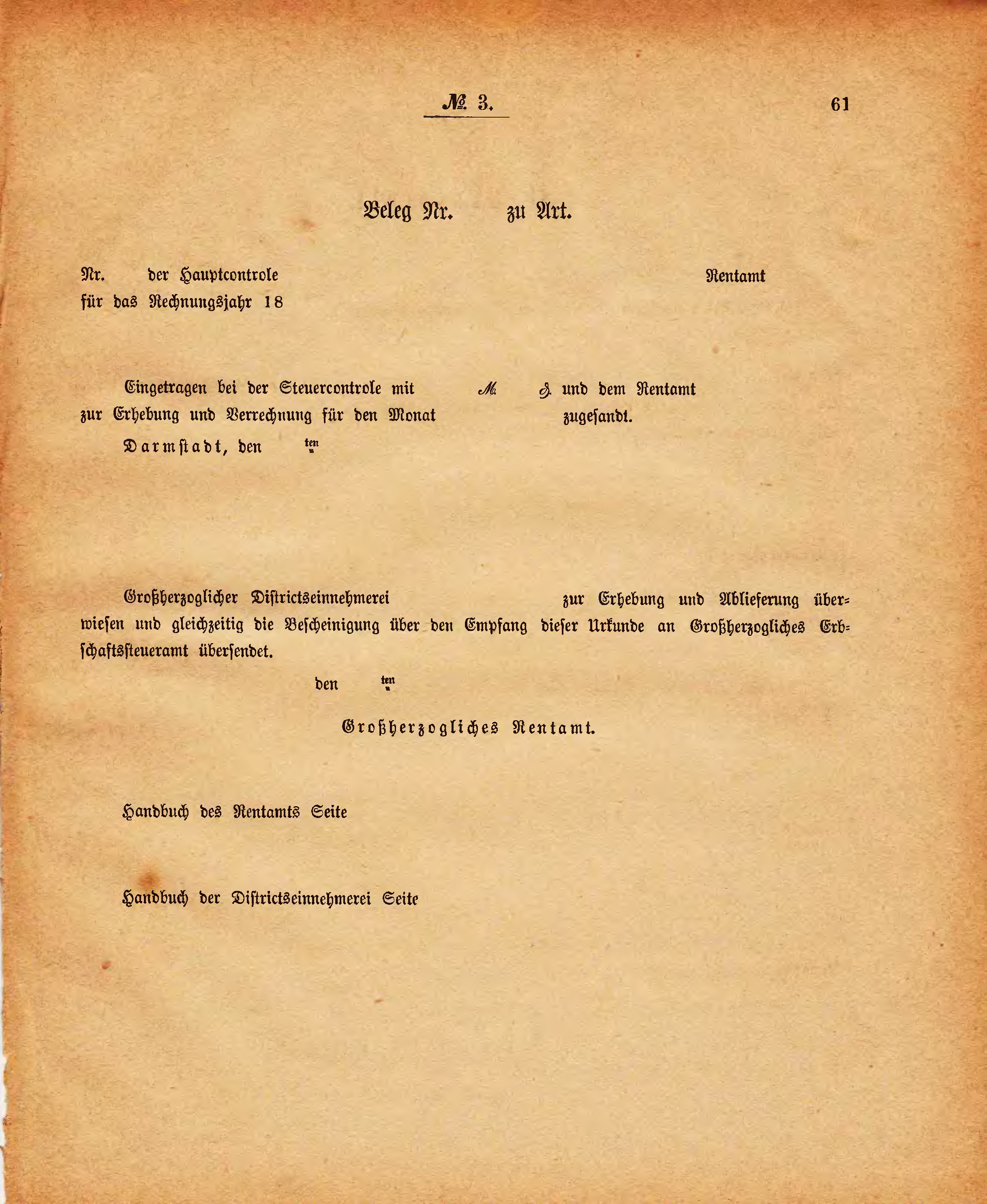 | Großherzoglicher Districtseinnehmerei ......................... zur Erhebung und Ablieferung überwiesen und gleichzeitig die Bescheinigung über den Empfang dieser Urkunde an Großherzogliches Erbschaftssteueramt übersendet. |