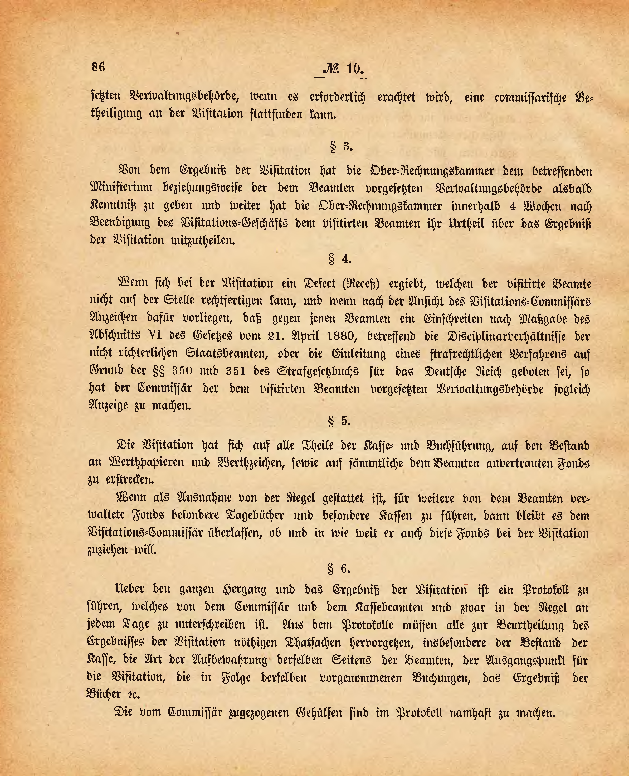 Die Visitation hat sich auf alle Theile der Kasse- und Buchführung, auf den Bestand an Werthpapieren und Werthzeichen, sowie auf sämmtliche dem Beamten anvertrauten Fonds zu erstrecken.