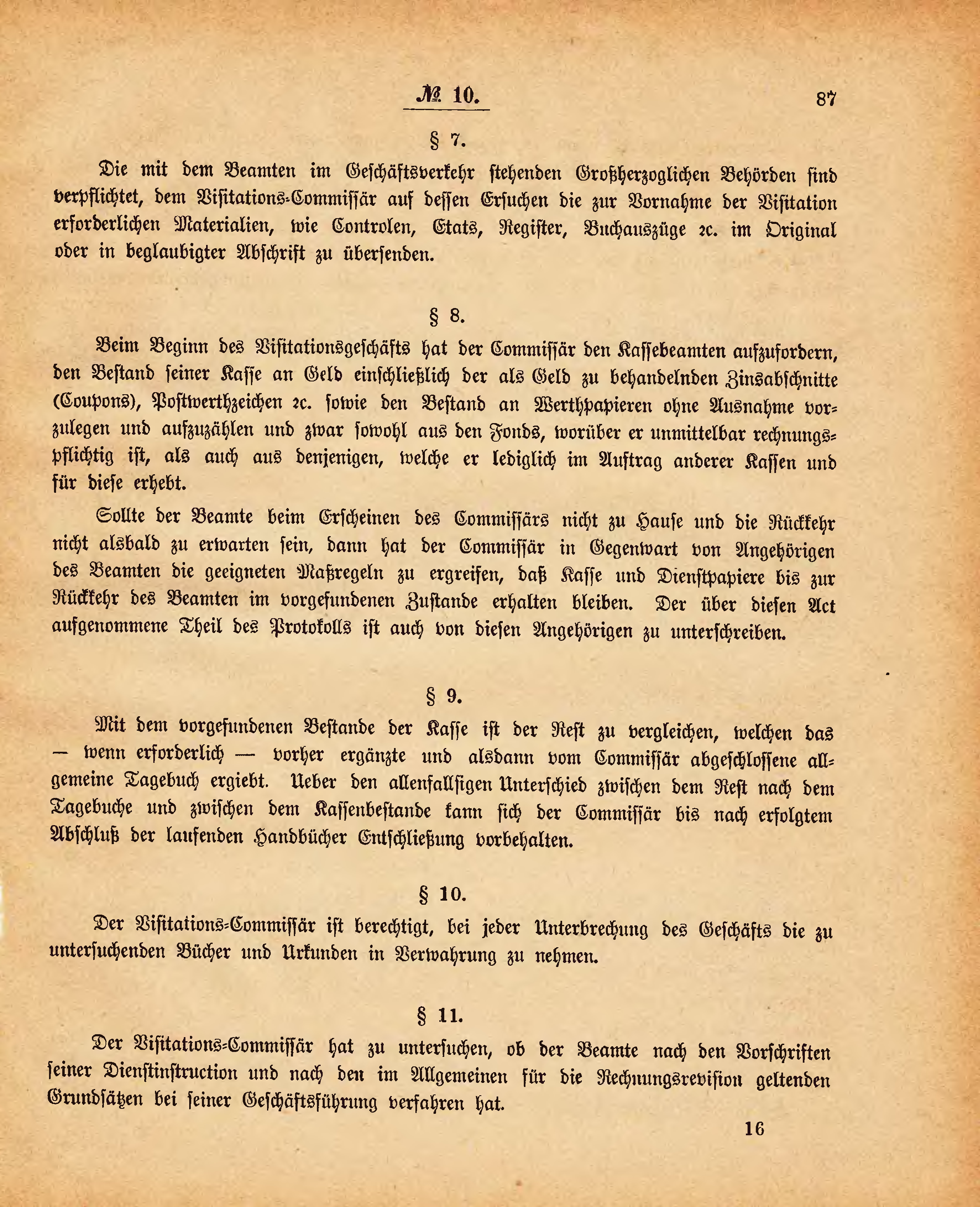 Die mit dem Beamten im Geschäftsverkehr stehenden Großherzoglichen Behörden sind verpflichtet, dem Visitations-Commissär auf dessen Ersuchen die zur Vornahme der Visitation erforderlichen Materialien, wie Controlen, Etats, Register, Buchauszüge etc. im Original oder in beglaubigter Abschrift zu übersenden.