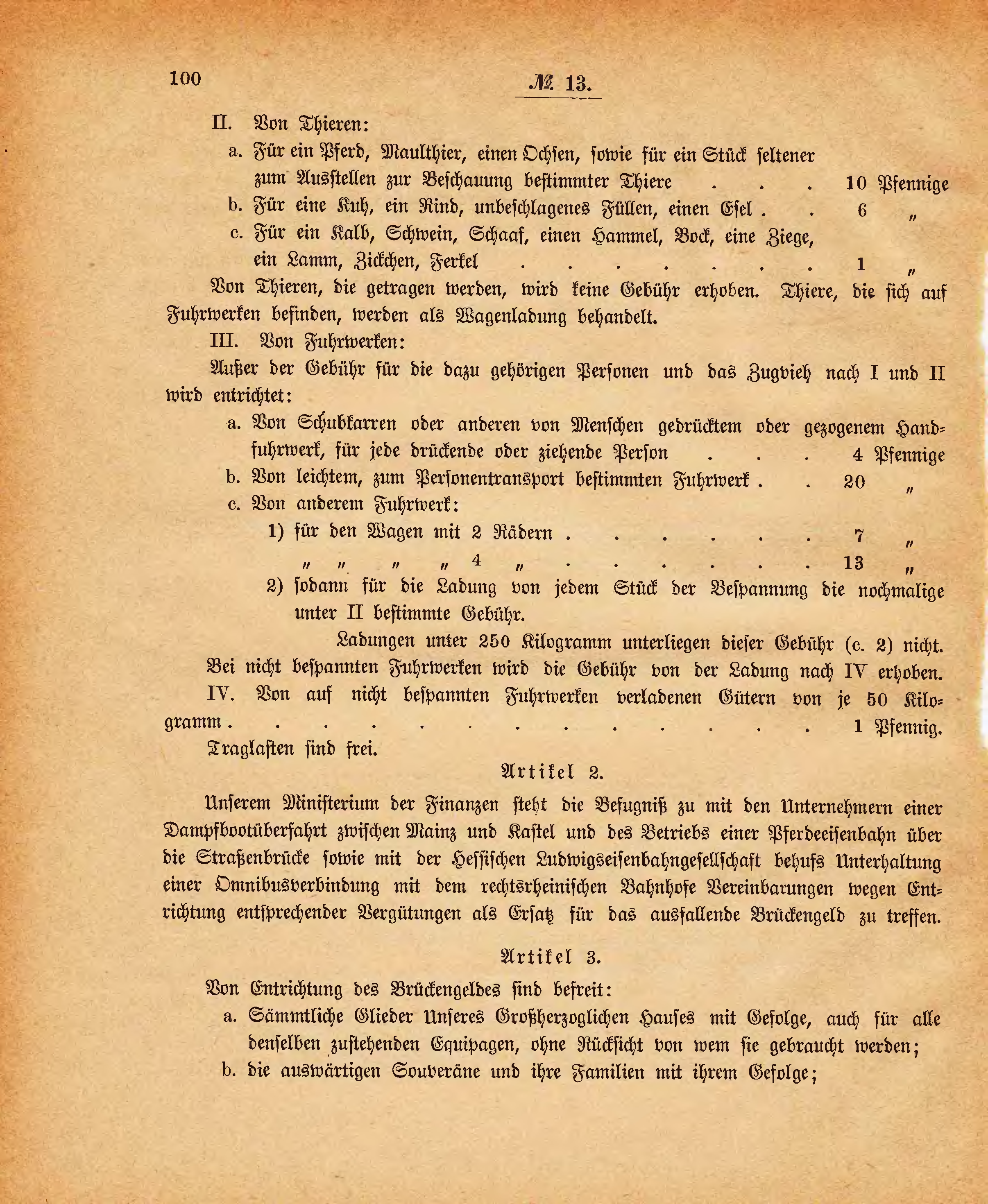 Unserem Ministerium der Finanzen steht die Befugniß zu mit den Unternehmern einer Dampfbootüberfahrt zwischen Mainz und Kastel und des Betriebs einer Pferdeeisenbahn über die Straßenbrücke sowie mit der Hessischen Ludwigseisenbahngesellschaft behufs Unterhaltung einer Omnibusverbindung mit dem rechtsrheinischen Bahnhofe Vereinbarungen wegen Entrichtung entsprechender Vergütungen als Ersatz für das ausfallende Brückengeld zu treffen.