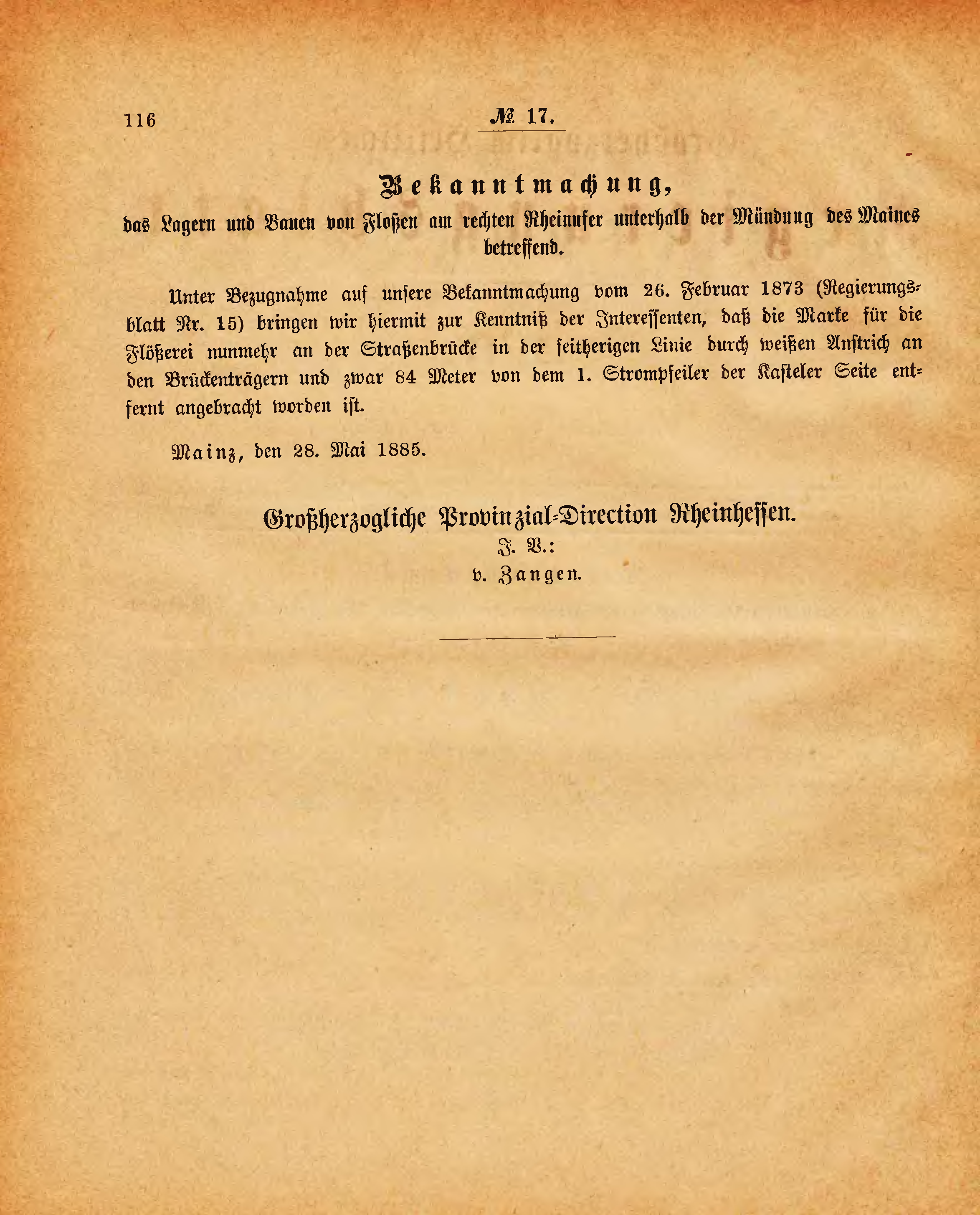 Unter Bezugnahme auf unsere Bekanntmachung vom 26. Februar 1873 (Regierungsblatt Nr. 15) bringen wir hiermit zur Kenntniß der Interessenten, daß die Marke für die Flößerei nunmehr an der Straßenbrücke in der seitherigen Linie durch weißen Anstrich an den Brückenträgern und zwar 84 Meter von dem 1. Strompfeiler der Kasteler Seite entfernt angebracht worden ist.