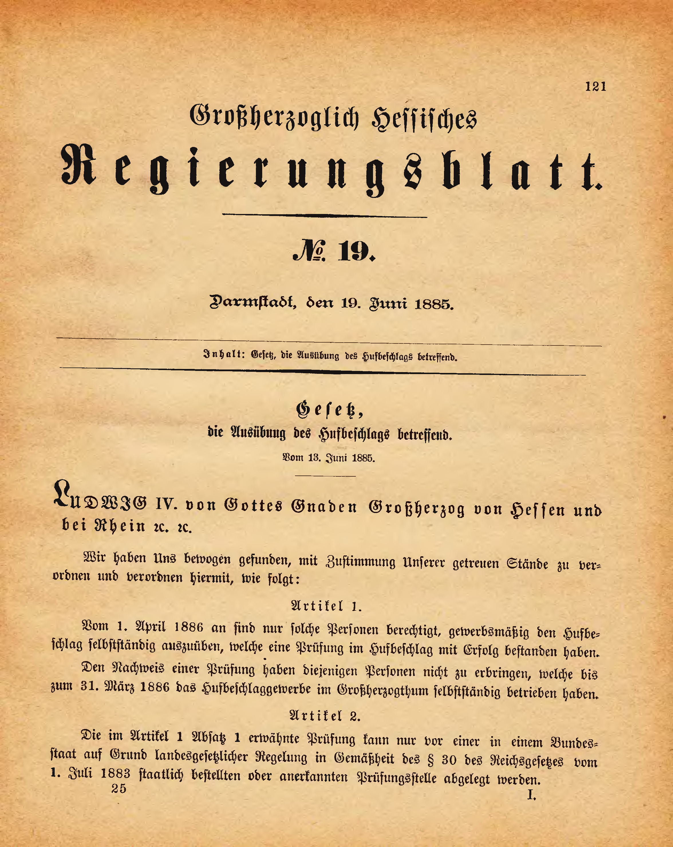 Vom 1. April 1886 an sind nur solche Personen berechtigt, gewerbsmäßig den Hufbeschlag selbstständig auszuüben, welche eine Prüfung im Hufbeschlag mit Erfolg bestanden haben.