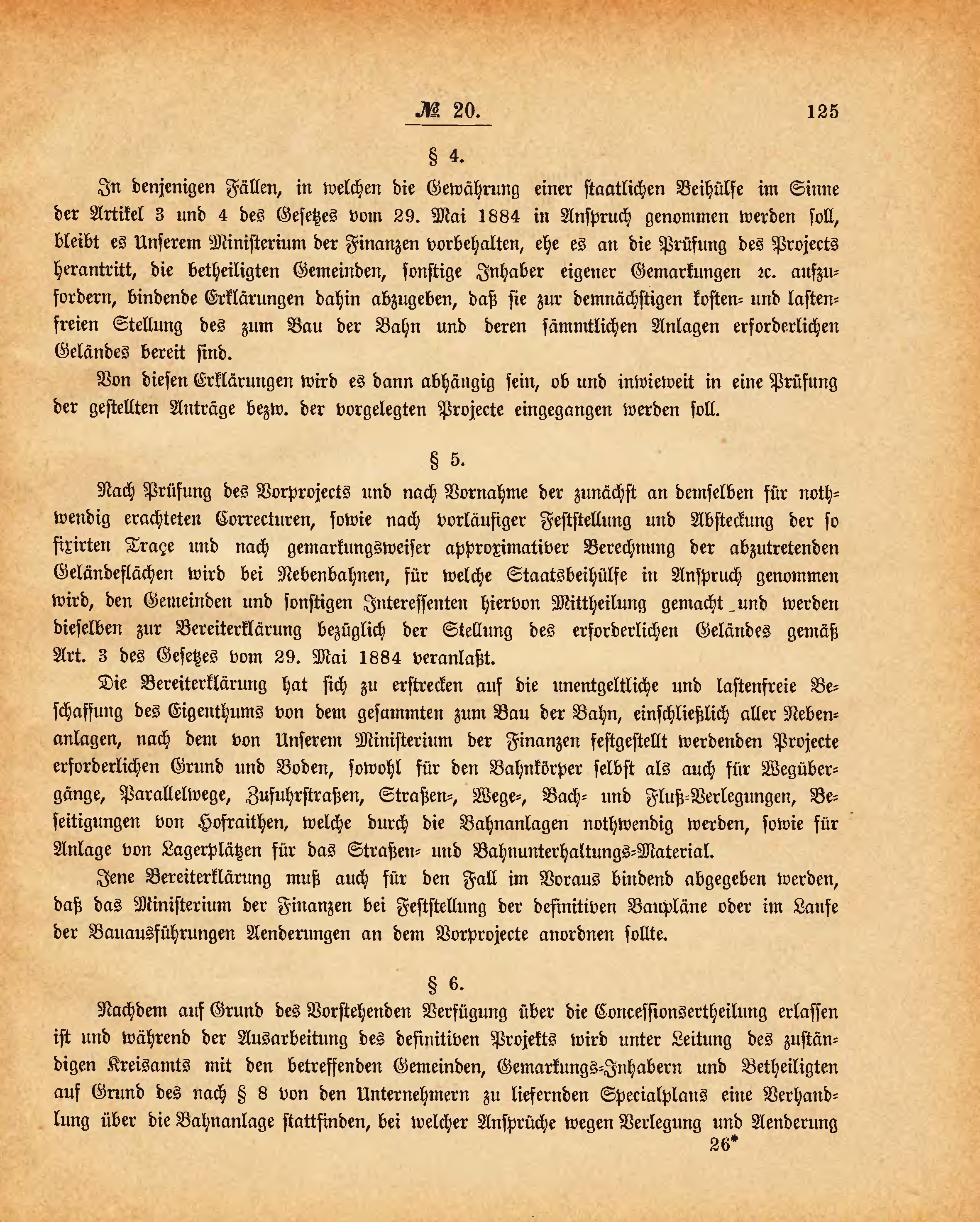 In denjenigen Fällen, in welchen die Gewährung einer staatlichen Beihülfe im Sinne der Artikel 3 und 4 des Gesetzes vom 29. Mai 1884 in Anspruch genommen werden soll, bleibt es Unserem Ministerium der Finanzen vorbehalten, ehe es an die Prüfung des Projects herantritt, die betheiligten Gemeinden, sonstige Inhaber eigener Gemarkungen etc. aufzufordern, bindende Erklärungen dahin abzugeben, daß sie zur demnächstigen kosten- und lastenfreien Stellung des zum Bau der Bahn und deren sämmtlichen Anlagen erforderlichen Geländes bereit sind.