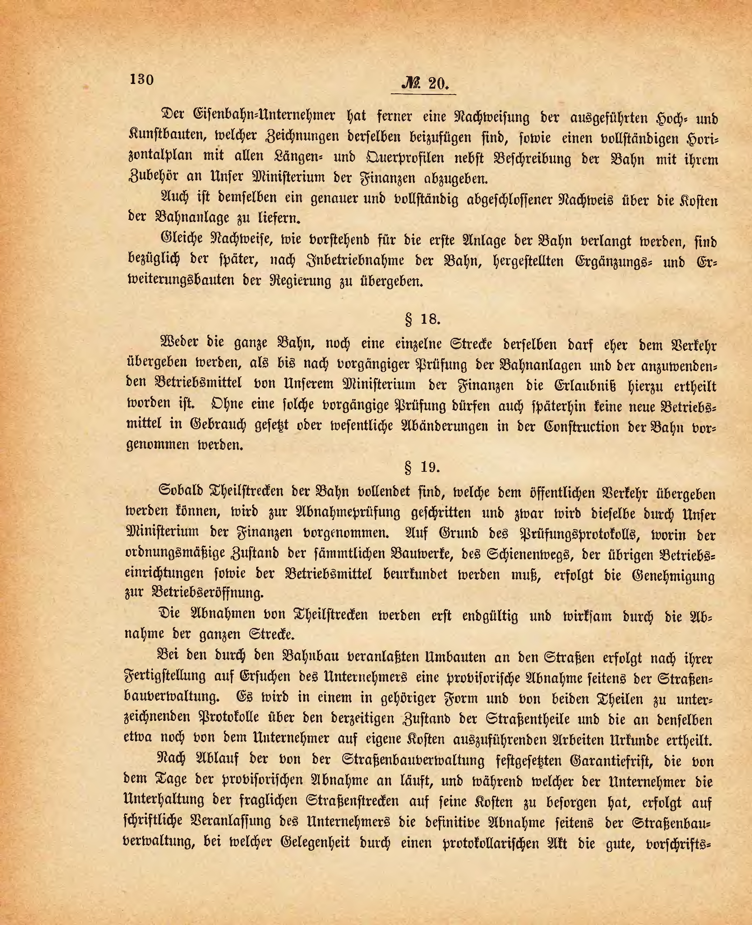 Sobald Theilstrecken der Bahn vollendet sind, welche dem öffentlichen Verkehr übergeben werden können, wird zur Abnahmeprüfung geschritten und zwar wird dieselbe durch Unser Ministerium der Finanzen vorgenommen. Auf Grund des Prüfungsprotokolls, worin der ordnungsmäßige Zustand der sämmtlichen Bauwerke, des Schienenwegs, der übrigen Betriebseinrichtungen sowie der Betriebsmittel beurkundet werden muß, erfolgt die Genehmigung zur Betriebseröffnung.