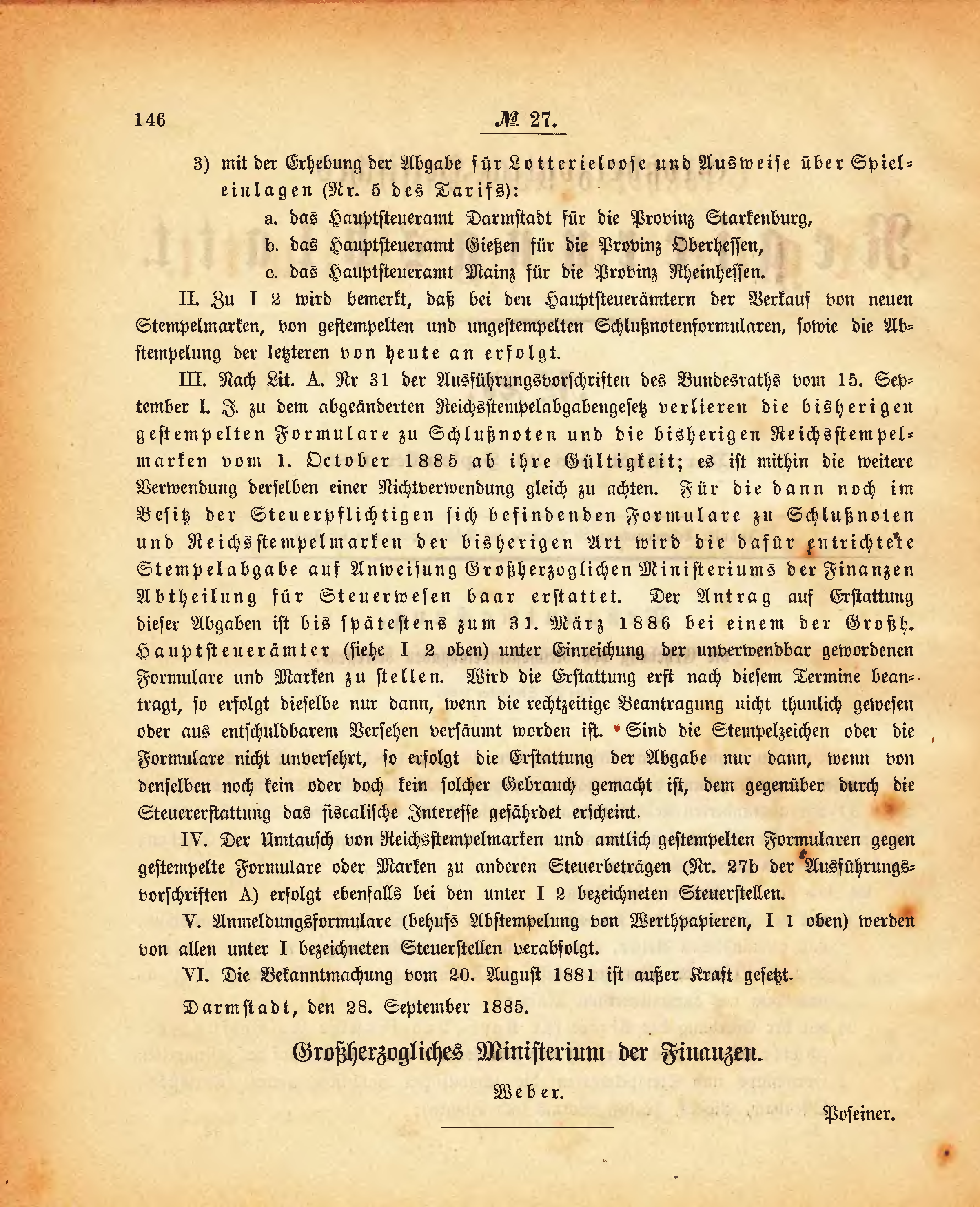 | III. | Nach Lit. A. Nr 31 der Ausführungsvorschriften des Bundesraths vom 15. September l. J. zu dem abgeänderten Reichsstempelabgabengesetz verlieren die bisherigen gestempelten Formulare zu Schlußnoten und die bisherigen Reichsstempelmarken vom 1. October 1885 ab ihre Gültigkeit; es ist mithin die weitere Verwendung derselben einer Nichtverwendung gleich zu achten. Für die dann noch im Besitz der Steuerpflichtigen sich befindenden Formulare zu Schlußnoten und Reichsstempelmarken der bisherigen Art wird die dafür entrichtete Stempelabgabe auf Anweisung Großherzoglichen Ministeriums der Finanzen Abtheilung für Steuerwesen baar erstattet. Der Antrag auf Erstattung dieser Abgaben ist bis spätestens zum 31. März 1886 bei einem der Großh. Hauptsteuerämter | |||