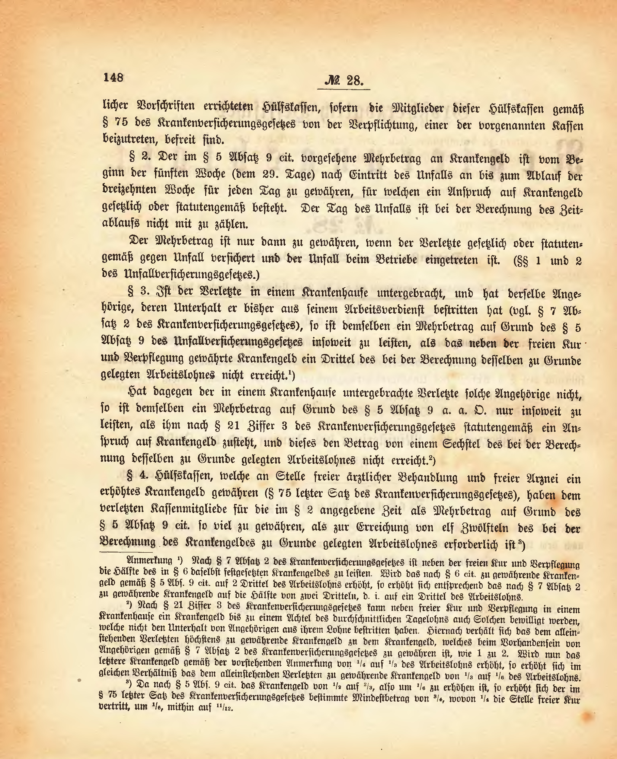 2) Nach § 21 Ziffer 3 des Krankenversicherungsgesetzes kann neben freier Kur und Verpflegung in einem Krankenhause ein Krankengeld bis zu einem Achtel des durchschnittlichen Tagelohns auch Solchen bewilligt werden, welche nicht den Unterhalt von Angehörigen aus ihrem Lohne bestritten haben. Hiernach verhält sich das dem alleinstehenden Verletzten höchstens zu gewährende Krankengeld zu dem Krankengeld, welches beim Vorhandensein von Angehörigen gemäß § 7 Absatz 2 des Krankenversicherungsgesetzes zu gewähren ist, wie 1 zu 2. Wird nun das letztere Krankengeld gemäß der vorstehenden Anmerkung von 1/4 auf 1/3 des Arbeitslohns erhöht, so erhöht sich im gleichen Verhältniß das dem alleinstehenden Verletzten zu gewährende Krankengeld von 1/8 auf 1/6 des Arbeitslohns.