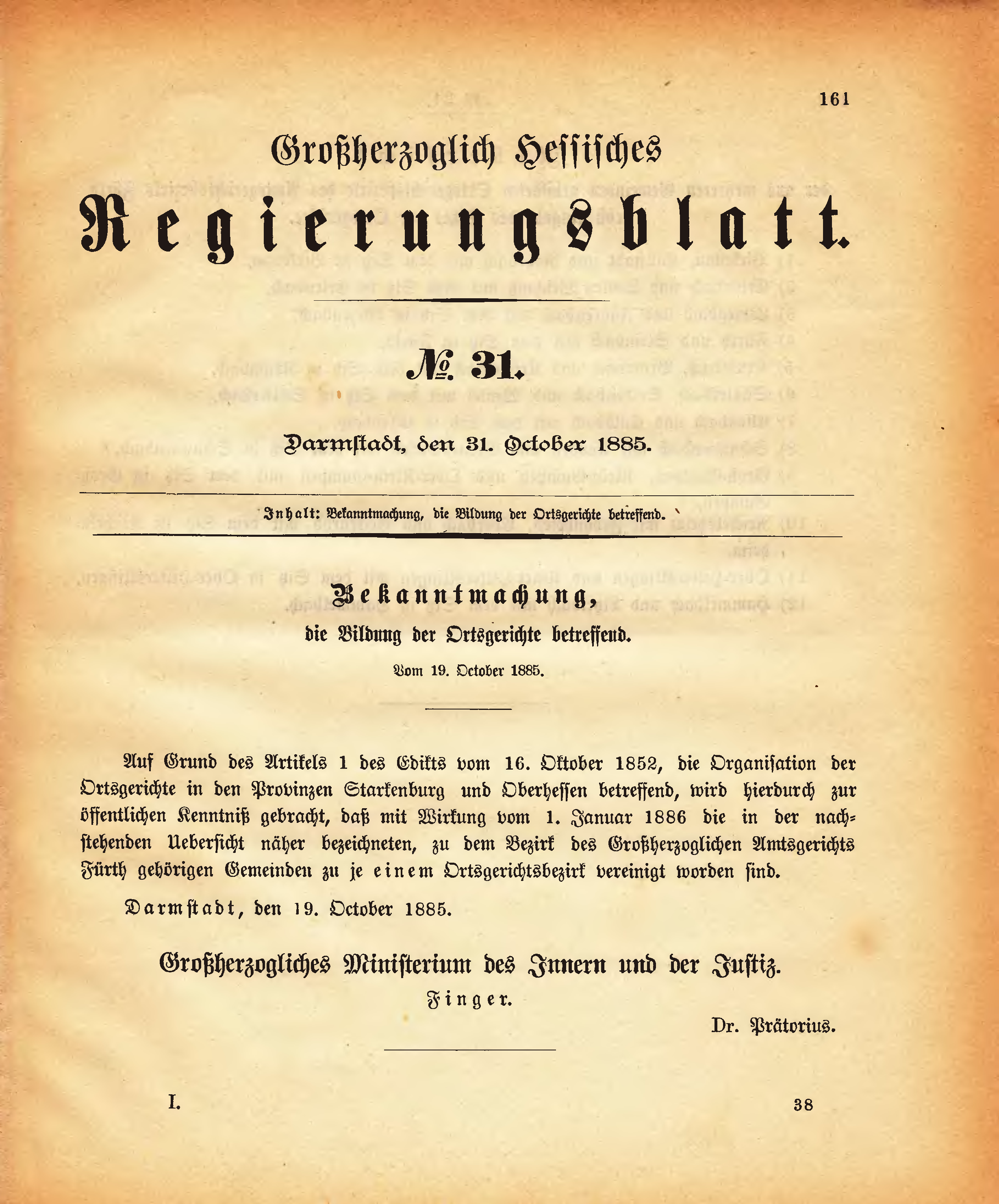 Auf Grund des Artikels 1 des Edikts vom 16. Oktober 1852, die Organisation der Ortsgerichte in den Provinzen Starkenburg und Oberhessen betreffend, wird hierdurch zur öffentlichen Kenntniß gebracht, daß mit Wirkung vom 1. Januar 1886 die in der nachstehenden Uebersicht näher bezeichneten, zu dem Bezirk des Großherzoglichen Amtsgerichts Fürth gehörigen Gemeinden zu je einem Ortsgerichtsbezirk vereinigt worden sind.