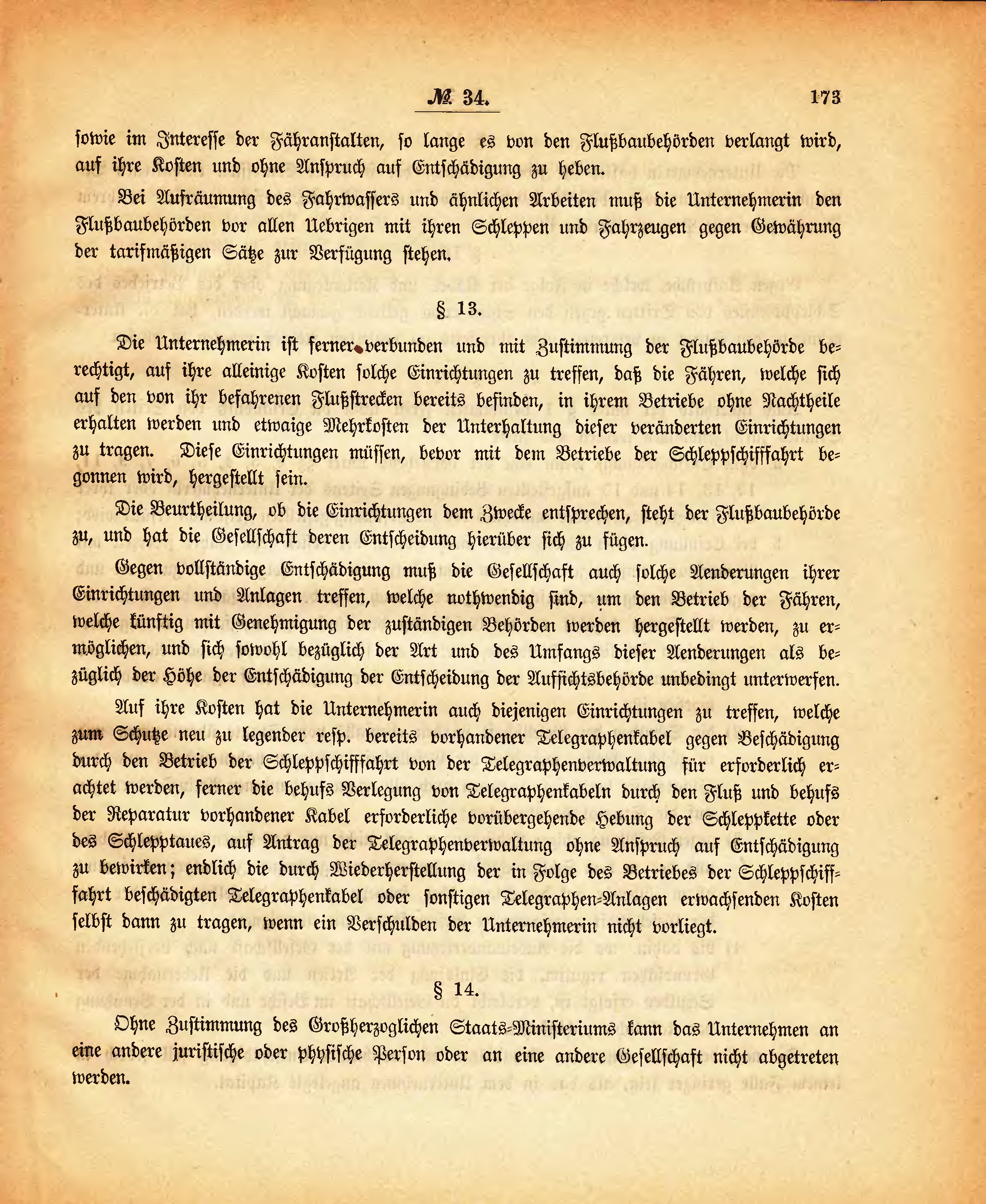 Die Unternehmerin ist ferner verbunden und mit Zustimmung der Flußbaubehörde berechtigt, auf ihre alleinige Kosten solche Einrichtungen zu treffen, daß die Fähren, welche sich auf den von ihr befahrenen Flußstrecken bereits befinden, in ihrem Betriebe ohne Nachtheile erhalten werden und etwaige Mehrkosten der Unterhaltung dieser veränderten Einrichtungen zu tragen. Diese Einrichtungen müssen, bevor mit dem Betriebe der Schleppschifffahrt begonnen wird, hergestellt sein.