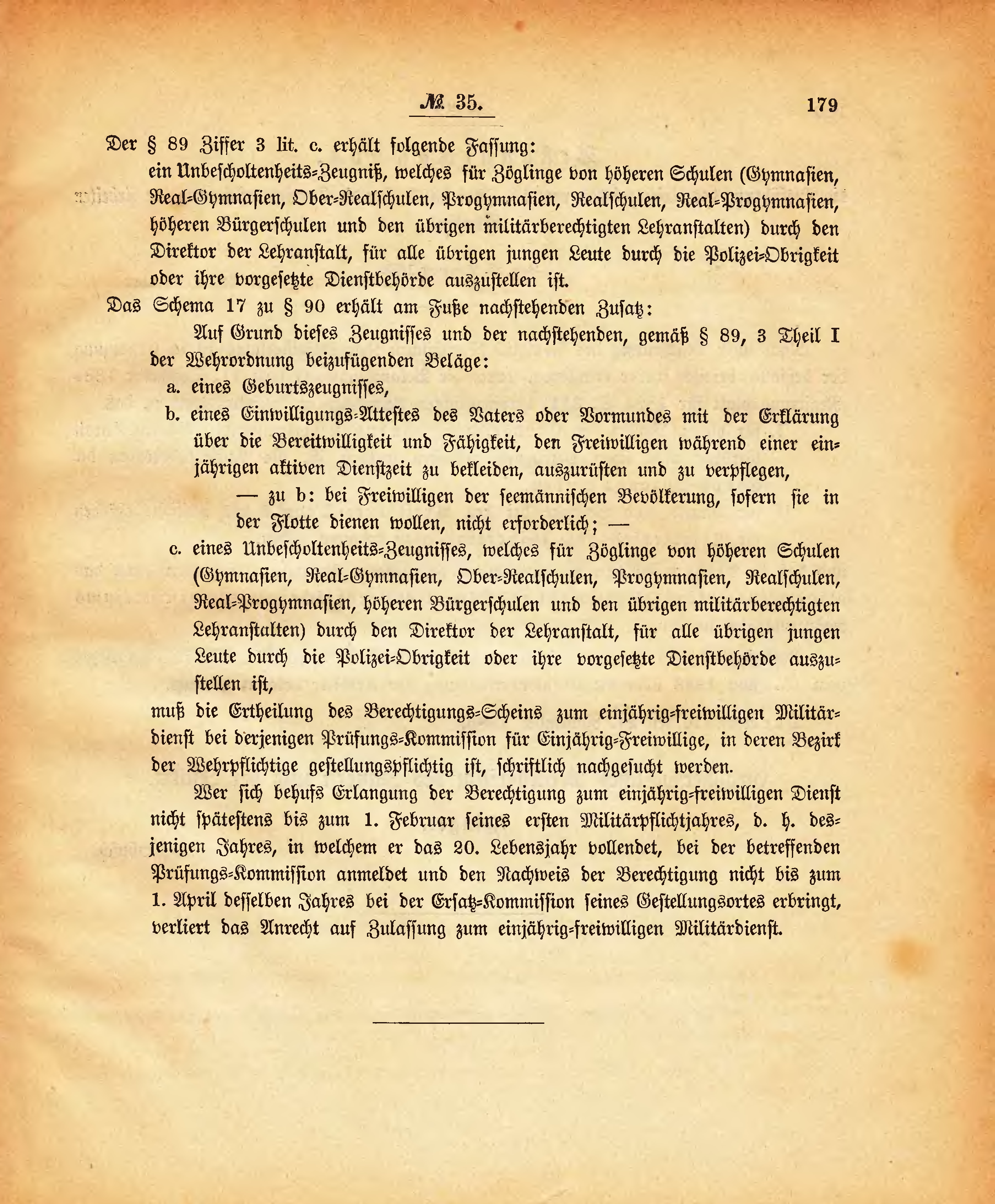 | ein Unbescholtenheits-Zeugniß, welches für Zöglinge von höheren Schulen (Gymnasien, Real-Gymnasien, Ober-Realschulen, Progymnasien, Realschulen, Real-Progymnasien, höheren Bürgerschulen und den übrigen militärberechtigten Lehranstalten) durch den Direktor der Lehranstalt, für alle übrigen jungen Leute durch die Polizei-Obrigkeit oder ihre vorgesetzte Dienstbehörde auszustellen ist. | ||||
