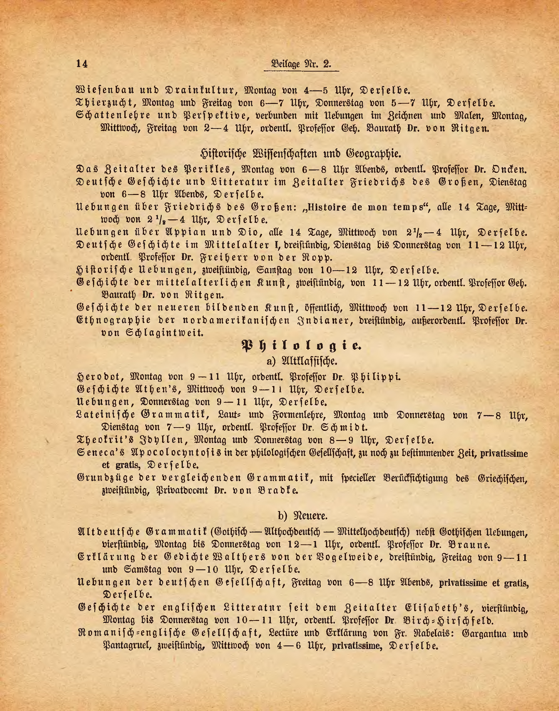 Altdeutsche Grammatik (Gothisch-Althochdeutsch-Mittelhochdeutsch) nebst Gothischen Uebungen, vierstündig, Montag bis Donnerstag von 12-1 Uhr, ordentl. Professor Dr. Braune.