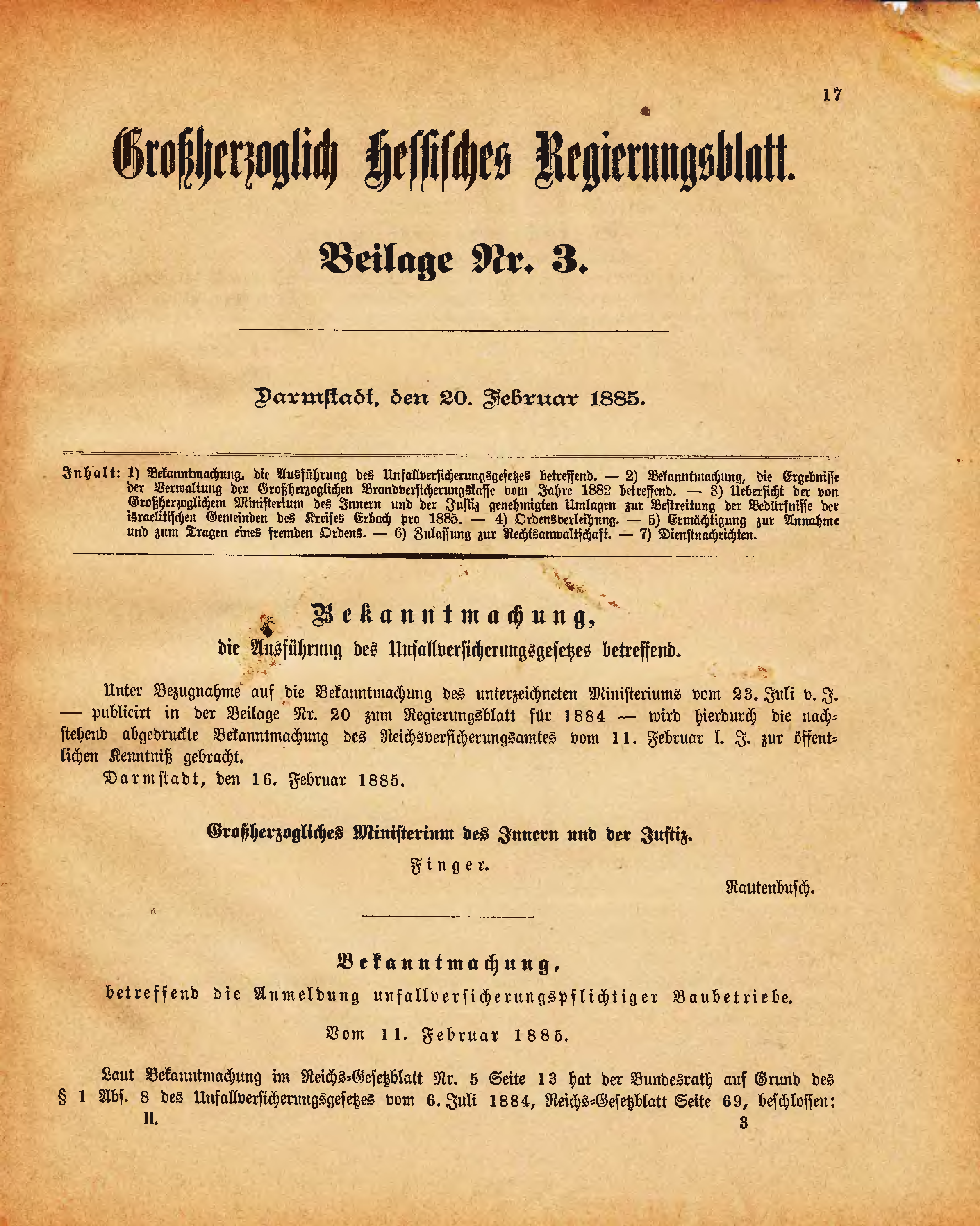 | Inhalt: | 1) Bekanntmachung, die Ausführung des Unfallversicherungsgesetzes betreffend. - 2) Bekanntmachung, die Ergebnisse der Verwaltung der Großherzoglichen Brandversicherungskasse vom Jahre 1882 betreffend. - 3) Uebersicht der von Großherzoglichem Ministerium des Innern und der Justiz genehmigten Umlagen zur Bestreitung der Bedürfnisse der israelitischen Gemeinden des Kreises Erbach pro 1885. - 4) Ordensverleihung. - 5) Ermächtigung zur Annahme und zum Tragen eines fremden Ordens. - 6) Zulassung zur Rechtsanwaltschaft. - 7) Dienstnachrichten. |