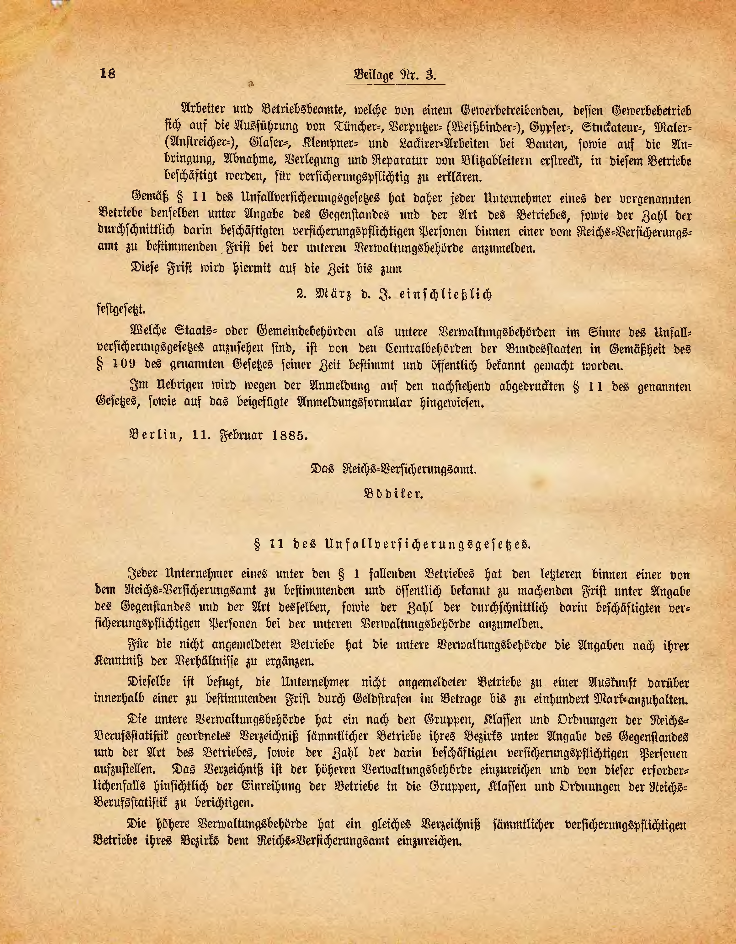Gemäß § 11 des Unfallversicherungsgesetzes hat daher jeder Unternehmer eines der vorgenannten Betriebe denselben unter Angabe des Gegenstandes und der Art des Betriebes, sowie der Zahl der durchschnittlich darin beschäftigten versicherungspflichtigen Personen binnen einer vom Reichs-Versicherungsamt zu bestimmenden Frist bei der unteren Verwaltungsbehörde anzumelden.