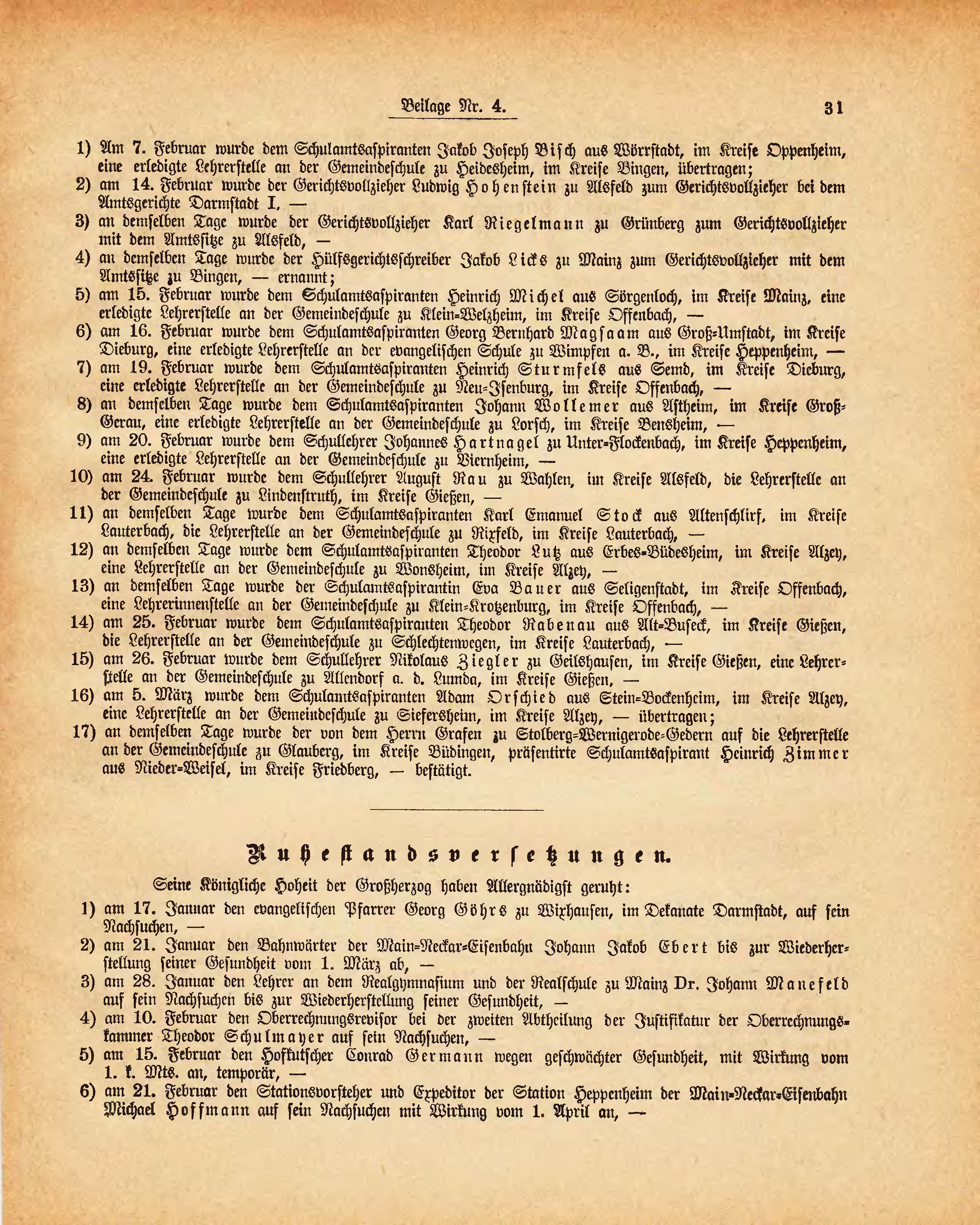 | 2) | am 14. Februar wurde der Gerichtsvollzieher Ludwig Hohenstein zu Alsfeld zum Gerichtsvollzieher bei dem Amtsgerichte Darmstadt I, - | ||